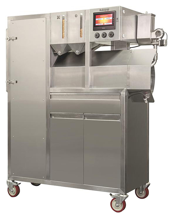Аппарат для попкорна RoboLabs Robopop 60 предназначен для раскрытия кукурузного зерна при помощи горячего воздуха на предприятиях пищевой промышленности. Распределение зерна по параболическому дну чаши рабочей камеры происходит равномерным слоем. Зерно постоянно находится в движении вокруг оси чаши, перемешивается и равномерно прогревается. Благодаря вихревому воздушному потоку внутри камеры, раскрывшиеся зерна немедленно удаляются из горячей зоны, что благотворно сказывается на качестве и вкусе попкорна.