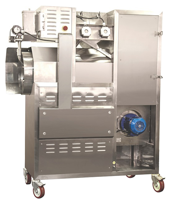 Модель оснащена двойным дозатором и сифтером, куда попадает раскрытое кукурузное зерно, и происходит отделение шелухи и нераскрытых зерен от готового попкорна. В последующем такой попкорн идеально подходит для нанесения карамельной смеси или изготовления попкорна с заданным вкусом. Оборудование выполнено из нержавеющей стали.