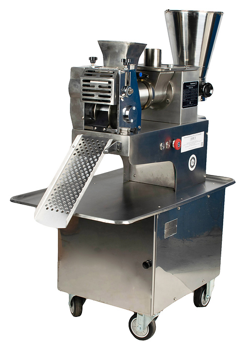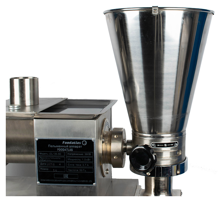 Пельменный аппарат Foodatlas JGL 135-5C используется на предприятиях общественного питания и торговли для производства пельменей и вареников с разнообразными начинками. Модель оснащена двухступенчатым лопастным насосом, формовочным барабаном с функцией автоматической подсыпки муки для предотвращения прилипания теста и опорными колесами с системой стопорных механизмов для блокировки станины. Станина и все детали, контактирующие с пищевыми продуктами, выполнены из нержавеющей стали.