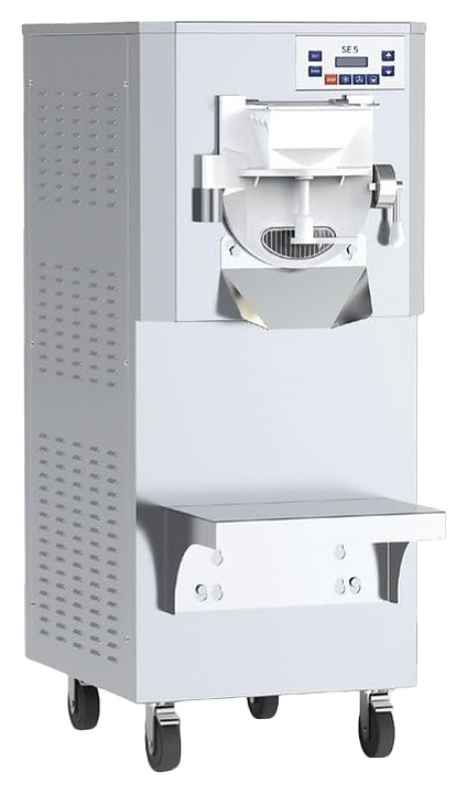 Напольный батч-фризер CARPINI SE5 A используется в барах, кафе и других предприятиях общественного питания, в специальных отделах развлекательных и торговых центров для приготовления и подачи твердого мороженого, джелато или сорбета. Модель оснащена горизонтальным цилиндром, трехлопастной мешалкой и электронным контроллером с цифровым дисплеем. Корпус выполнен из нержавеющей стали, цилиндр и основание мешалки – из нержавеющей стали марки AISI 304, лопасти мешалки – из полимера.