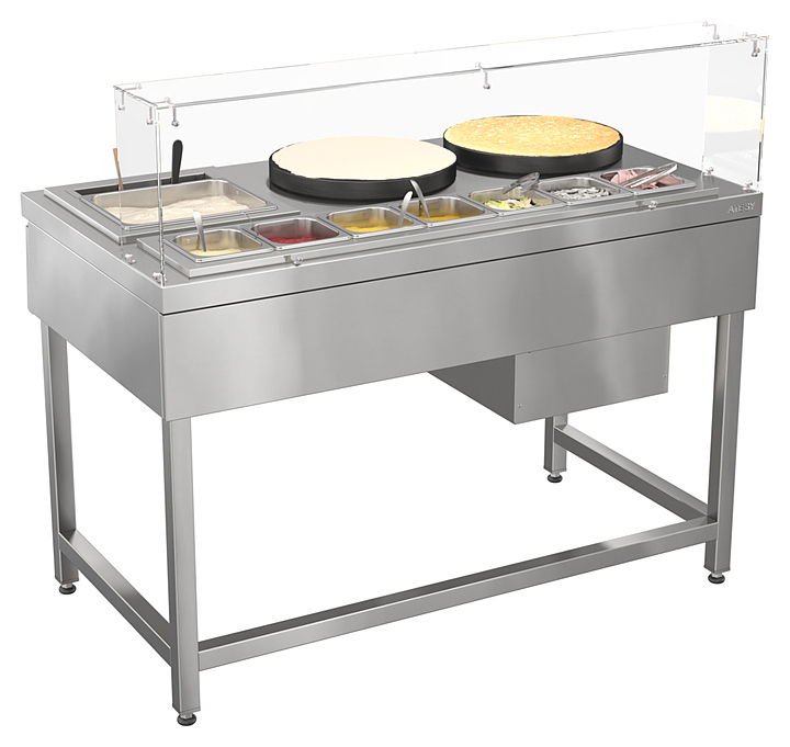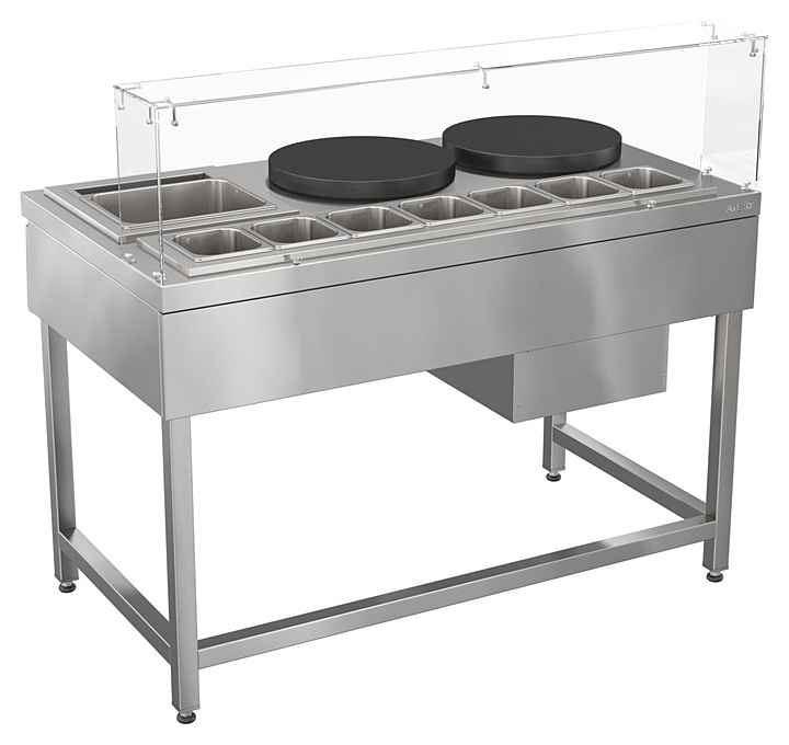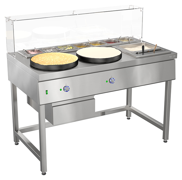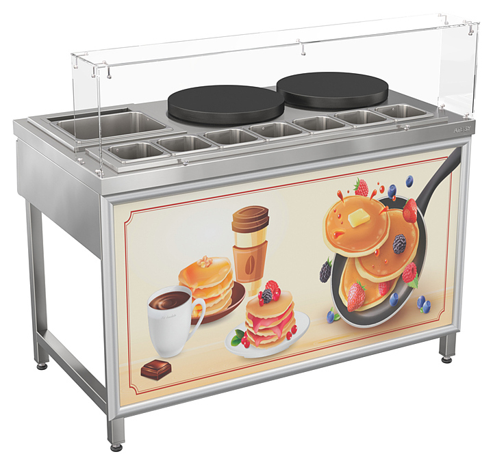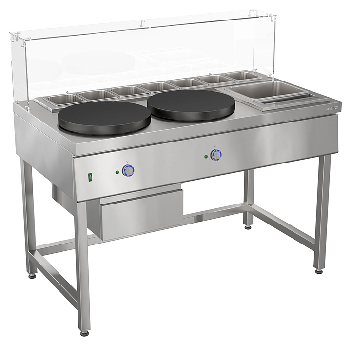 Блинная станция ATESY Лакомка БС-2.400-1350.750-02 используется на предприятиях общественного питания и торговли для комплексного оснащения рабочего места приготовления и раздачи блинов с начинкой. Модель оснащена двухконфорочным электрическим блинным аппаратом и съемными гастронормированными холдерами для размещения емкостей с тестом и начинками. Корпус выполнен из коррозинностойкой стали, стойки каркаса - из нержавеющей трубы сечением 40x40 мм, конфорки - из чугуна.