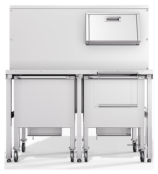 Бункер для льда Abat БН-2-70-90 используется совместно с льдогенераторами ЛГ-250, ЛГ-400, ЛГ-620 и ЛГ-1200 для кратковременного хранения чешуйчатого льда и его транспортировки к местам применения на предприятиях общественного питания и торговли. Модель оснащена задвижкой, предотвращающей потерю льда при смене бункеров во время работы, краном для слива воды, полочкой для совка, выгружным технологическим люком для извлечения небольших порций льда и проведения санитарной обработки изделия и регулируемыми по высоте ножками. Конструкция выполнена из высококачественной нержавеющей стали. Изоляция стенок и полости стола выполнена методом заливки пенополиуретаном.