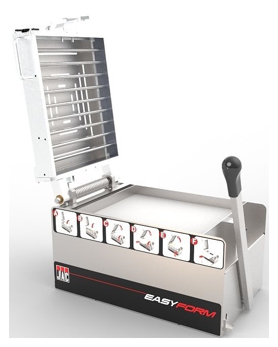 Делитель-формовщик Jac Easyform используется на предприятиях общественного питания и торговли для распределения всех видов теста и придания подходящей формы. Кювета, корпус и шасси изготовлены из нержавеющей стали.