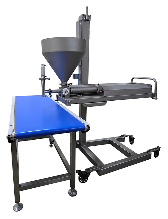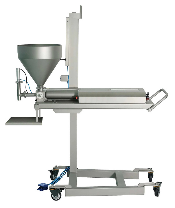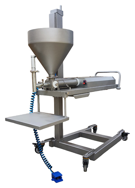 Кондитерский депозитор ?Danler NFS-1000 предназначен для точного дозирования различных типов теста, наполнения жидких, кремообразных и пастообразных продуктов на кондитерских и хлебопекарных предприятиях. Модель оснащена системой пневматического подъема и спуска продуктов в бункер, насадкой с вертикальным отсекателем, счетчиком доз, рабочей платформой, педалью управления и колесами с упорным тормозом для легкого перемещения. Корпус выполнен из нержавеющей стали SUS 304.