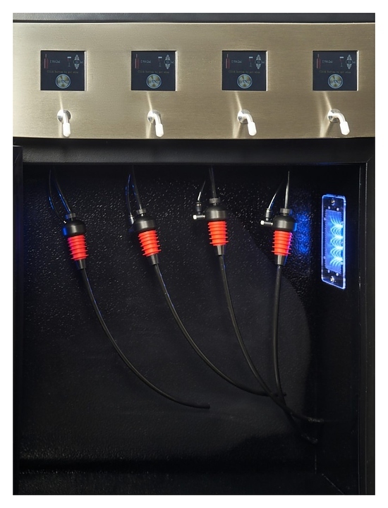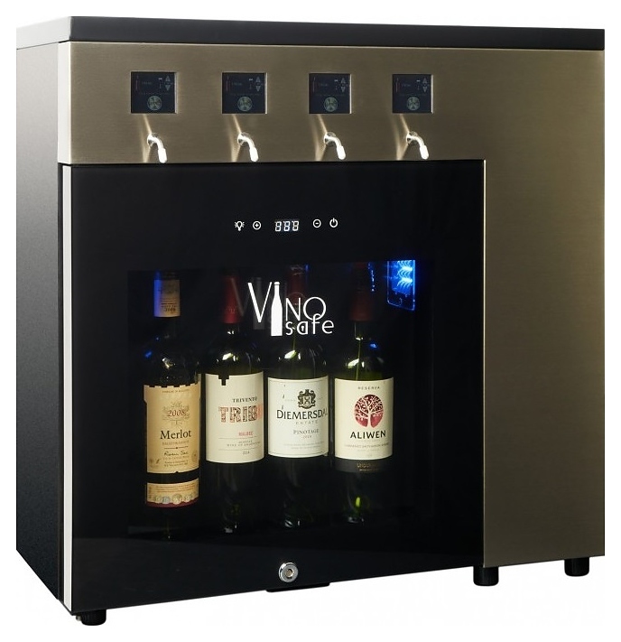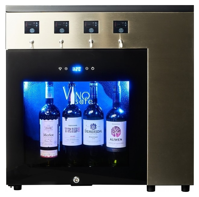 Диспенсер Vinosafe VSWD04AM предназначен для охлаждения и дозированного розлива бутилированного вина 4 различных сортов в барах, ресторанах, на других предприятиях общественного питания, а также домашних условиях. Модель оснащена холодильной камерой, системой подачи напитка с 4 заборными трубками с колпачками и 4 кранами, распашной дверью, прозрачным обзорным остеклением, внешней сенсорной панелью управления с цифровым дисплеем и 4 жидкокристаллическими сенсорными экранами для управления розливом. Корпус и рама двери выполнены из металла с антикоррозийным покрытием черного цвета, фронтальная панель – из металла с серебристой поверхностью.
