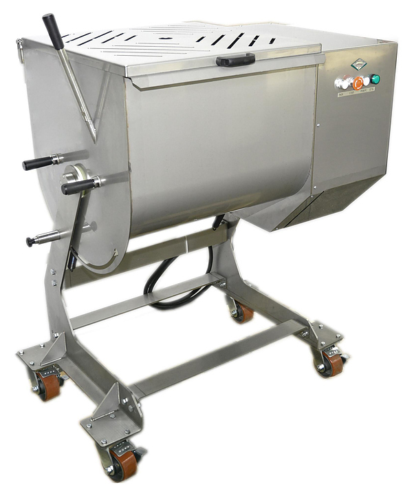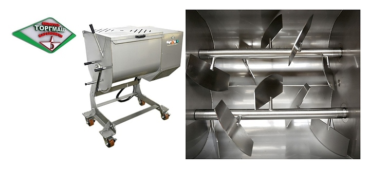 Фаршемешалка БЕЛТОРГМАШ МПФ-100.В2 используется на предприятиях общественного питания и торговли для равномерного перемешивания для перемешивания фарша, мяса в кусках массой до 0,5 кг, а также вязких и пастообразных пищевых продуктов с компонентами. Модель оснащена 2 ворошителями, опрокидывающимся бункером, крышкой с отверстиями-дозаторами и концевым выключателем и колесиками со стопором. Корпус и ворошитель выполнены из высококачественной нержавеющей стали.
