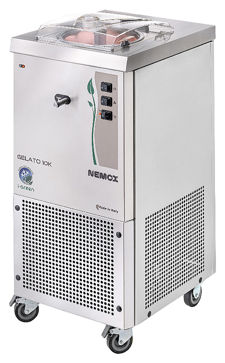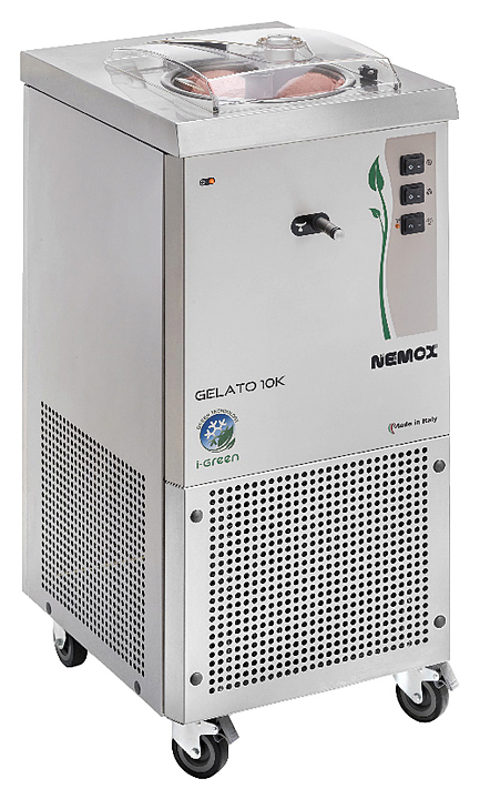 Фризер для мороженого Nemox i-Green Gelato 10K используется в барах, кафе, на открытых летних площадках, в специальных отделах супермаркетов и торговых центрах для приготовления мороженого кремообразной текстуры, сорбета, гранита и других холодных десертов. Модель оснащена простой интуитивно понятной панелью управления с 3 кнопками, индукционным двигателем с термостатом, фиксированной емкостью и крышкой с отверстием для добавления ингредиентов и датчиком, блокирующим вращение лопасти при ее подъеме. Корпус выполнен из нержавеющей стали AISI 304, емкость и лопасти для перемешивания - из нержавеющей стали.