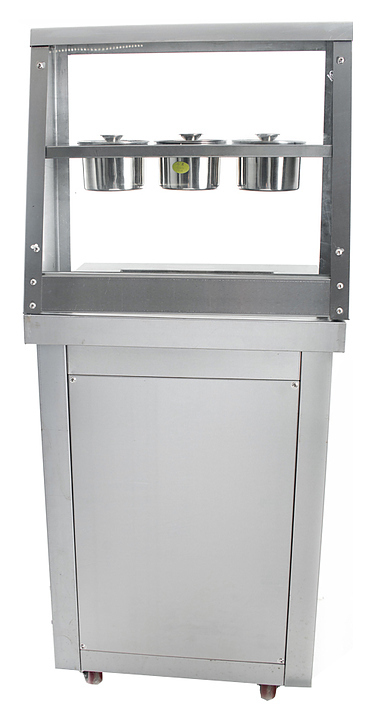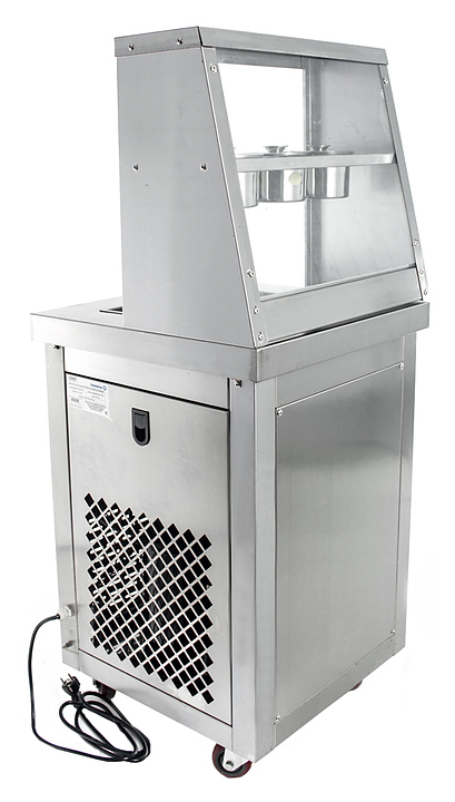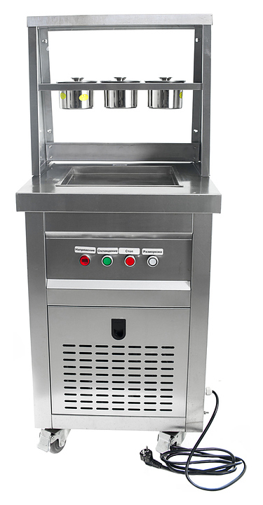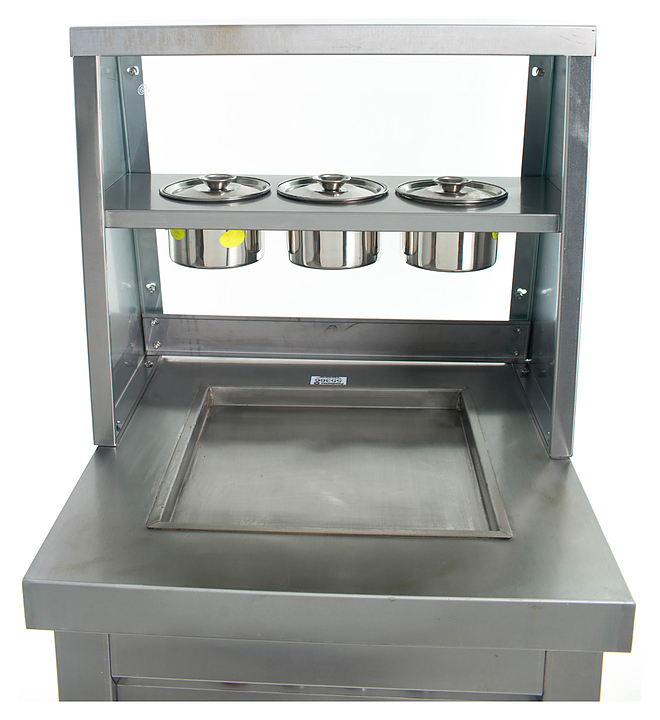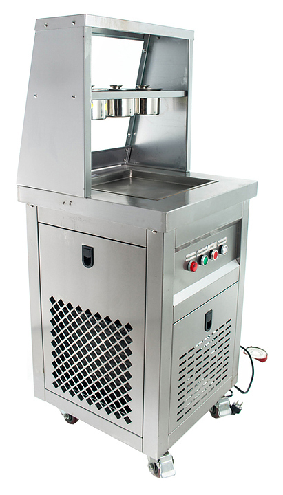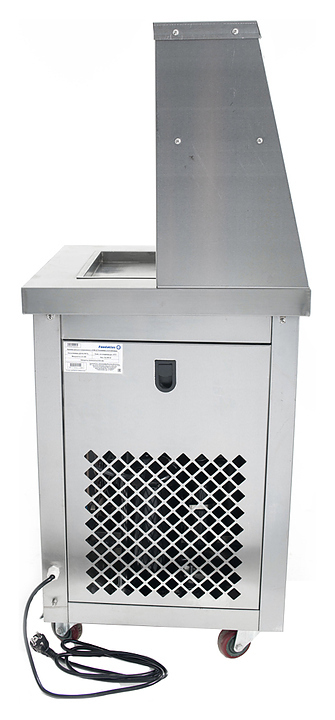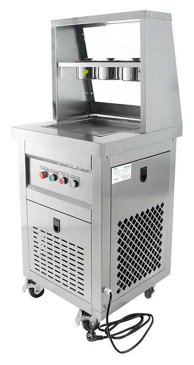 Фризер для мороженого Foodatlas KCB-1F используется на предприятиях общественного питания и торговли для приготовления жареного мороженого в роллах. Модель оснащена механическим управлением, 3 цилиндрическими контейнерами, квадратной охлаждаемой поверхностью для "жарки" десерта при минусовой температуре и 4 колесами, 2 из которых снабжены тормозом. Корпус выполнен из нержавеющей стали 430, сковорода и контейнеры - из нержавеющей стали 304, радиатор - из алюминия.