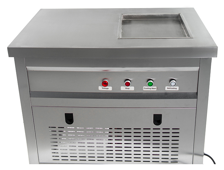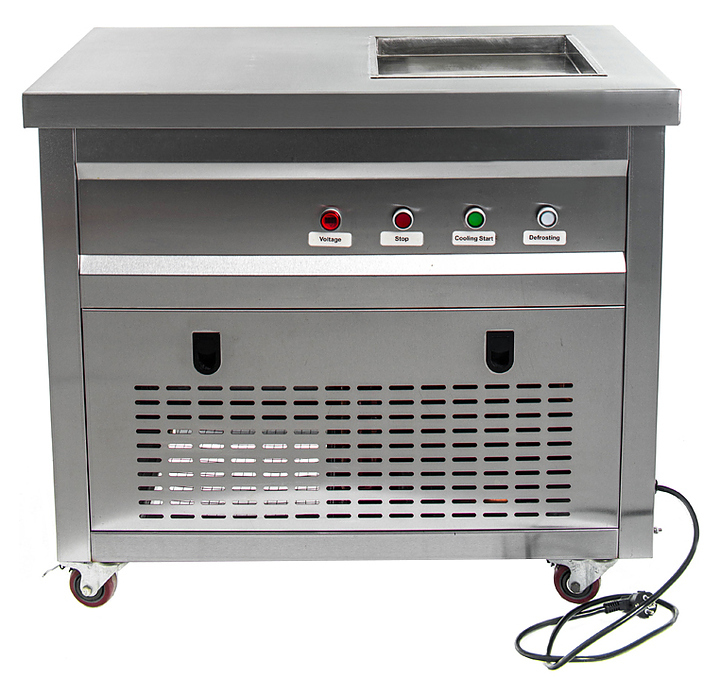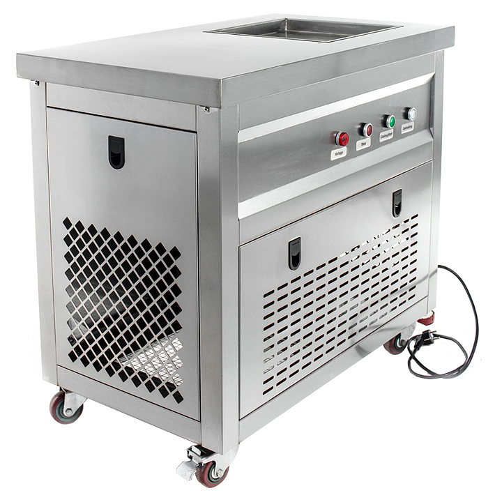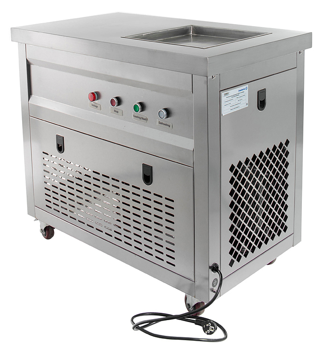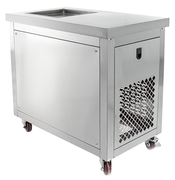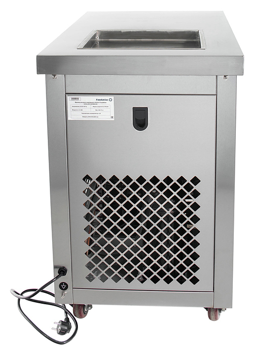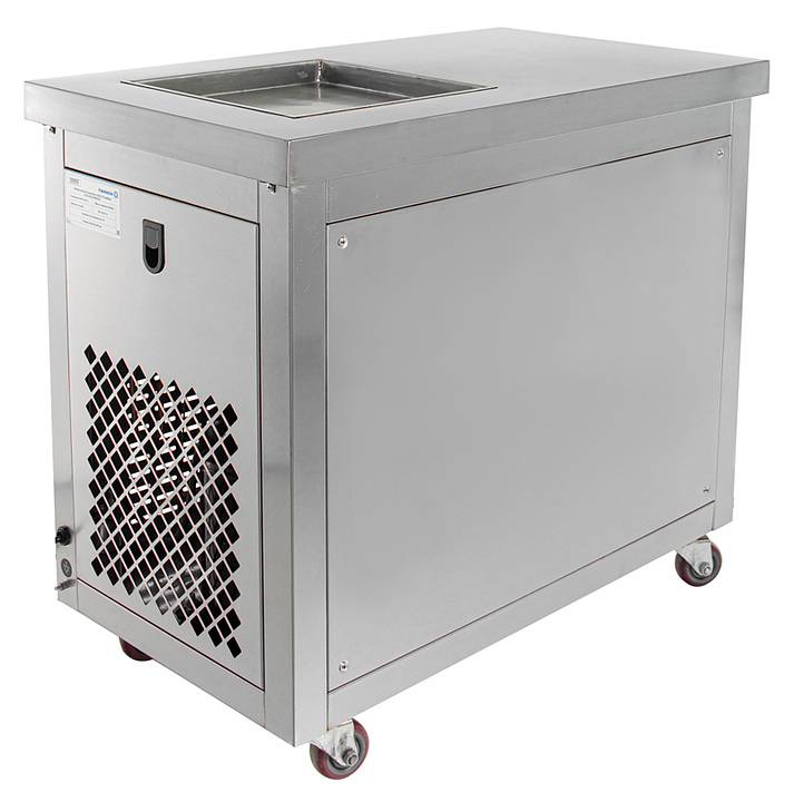 Фризер для мороженого Foodatlas KCB-1F используется на предприятиях общественного питания и торговли для приготовления жареного мороженого в роллах. Модель оснащена механическим управлением, столом для топпиногов, квадратной охлаждаемой поверхностью для "жарки" десерта при минусовой температуре и 4 колесами, 2 из которых снабжены тормозом. Корпус выполнен из нержавеющей стали 430, сковорода - из нержавеющей стали 304, радиатор - из алюминия.