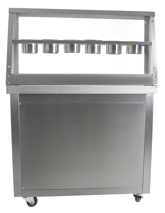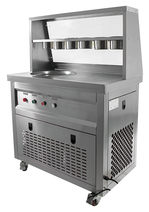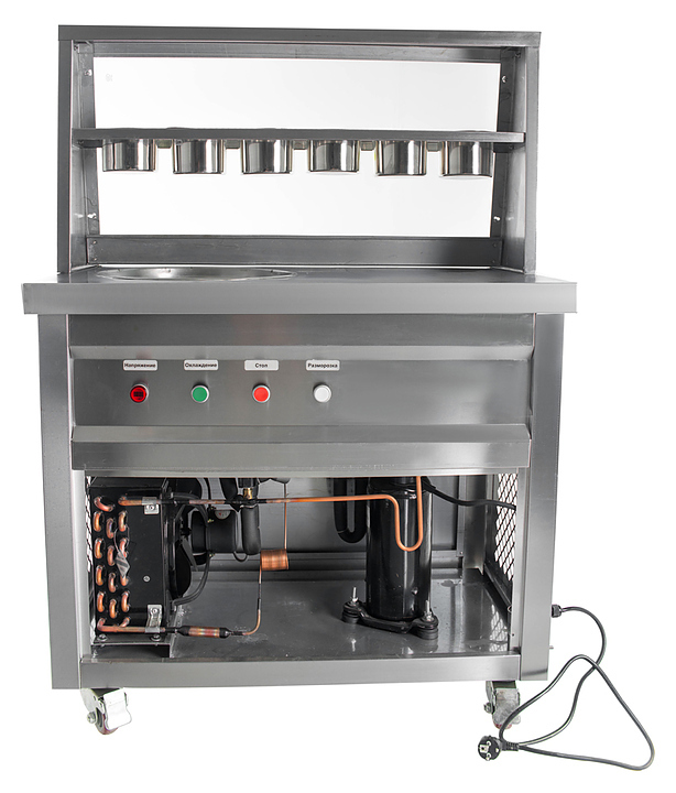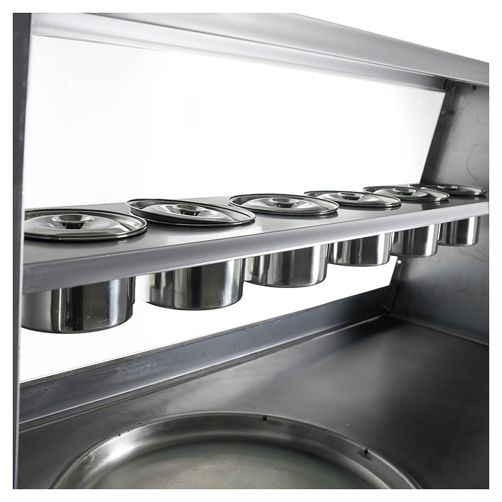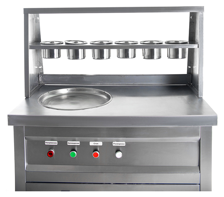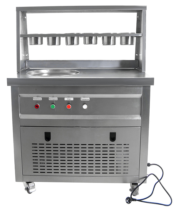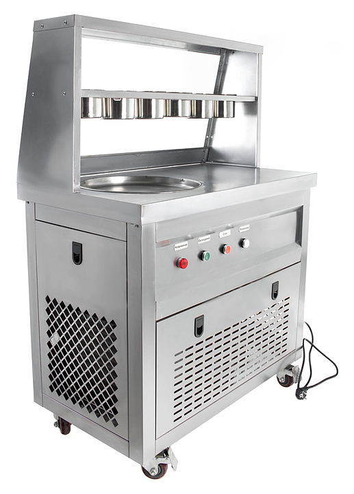Фризер для мороженого Foodatlas KCB-1Y используется на предприятиях общественного питания и торговли для приготовления жареного мороженого в роллах. Модель оснащена механическим управлением, столом для топпиногов, 3 цилиндрическими контейнерами, квадратной охлаждаемой поверхностью для "жарки" десерта при минусовой температуре и 4 колесами, 2 из которых снабжены тормозом. Корпус выполнен из нержавеющей стали 430, сковорода и контейнеры - из нержавеющей стали 304, радиатор - из алюминия.