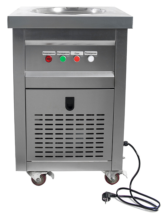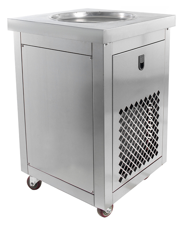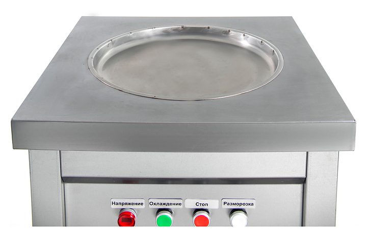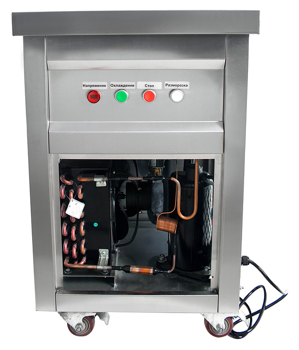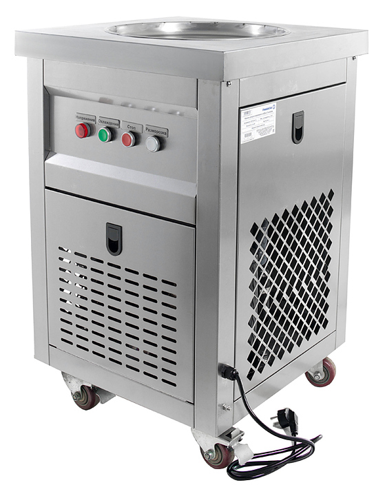 Фризер для мороженого Foodatlas KCB-1Y используется на предприятиях общественного питания и торговли для приготовления жареного мороженого в роллах. Модель оснащена механическим управлением, термоконтроллером, круглой охлаждаемой поверхностью для "жарки" десерта при минусовой температуре и 4 колесами, 2 из которых снабжены тормозом. Корпус выполнен из нержавеющей стали 430, сковорода - из нержавеющей стали 304, радиатор - из алюминия.