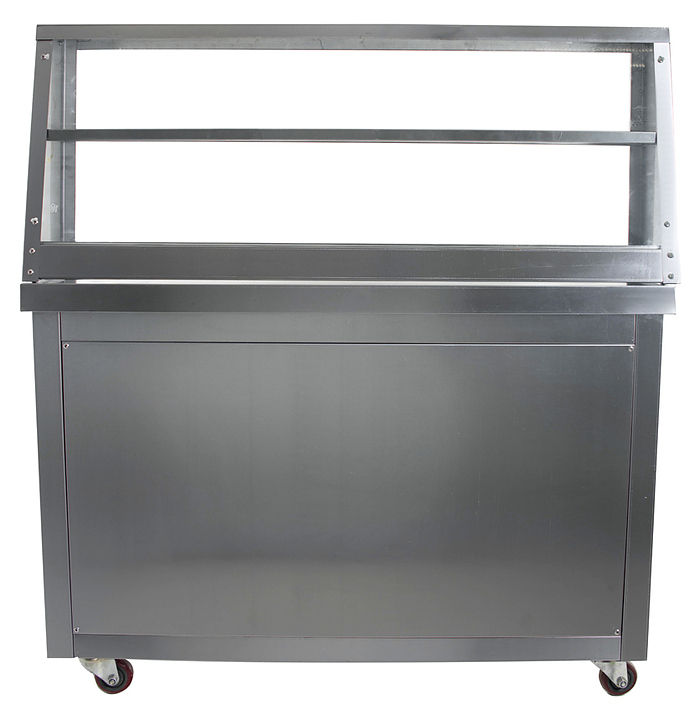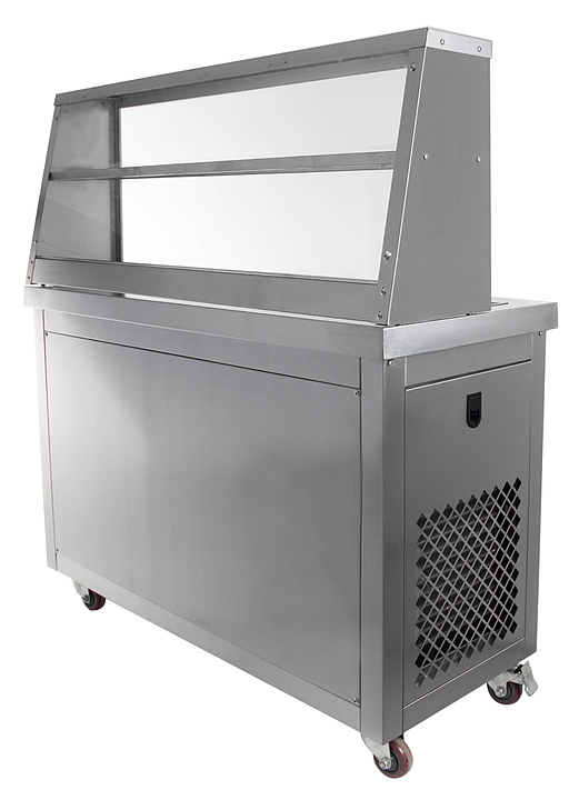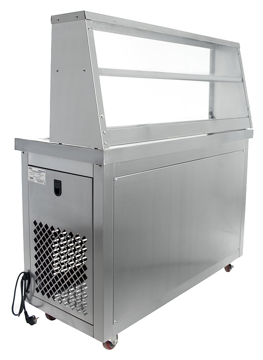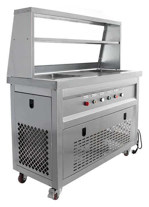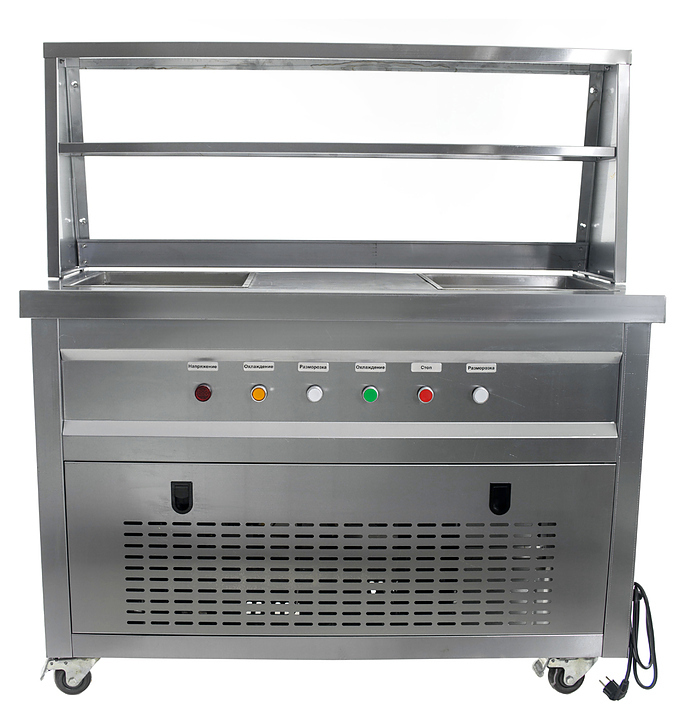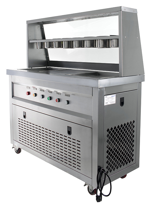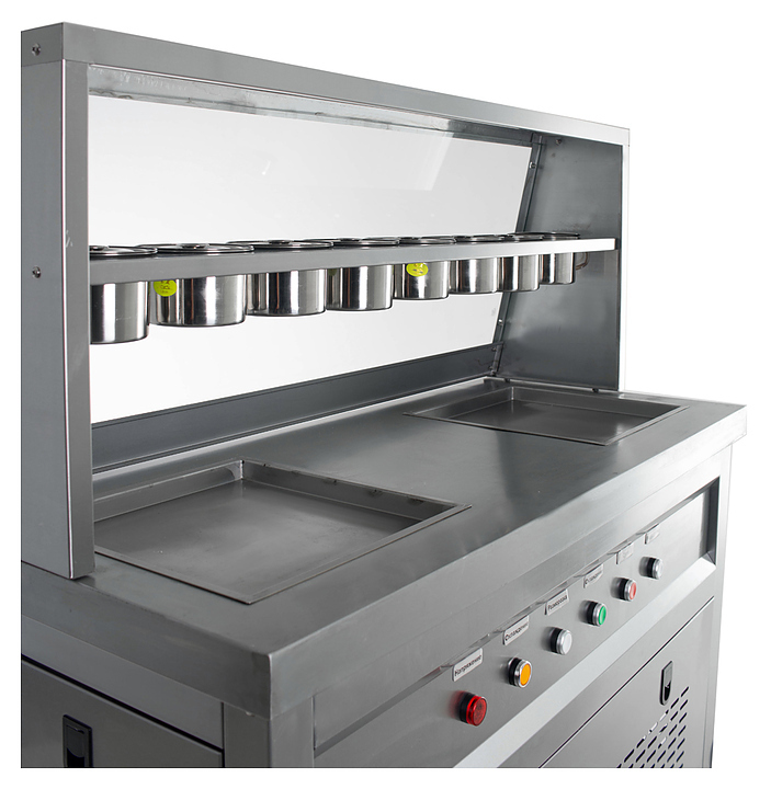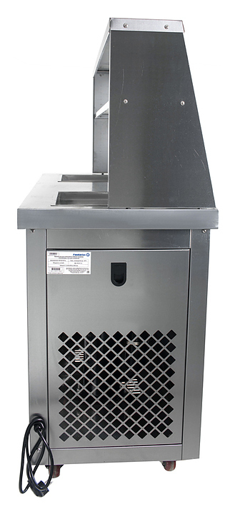 Фризер для мороженого Foodatlas KCB-2F используется на предприятиях общественного питания и торговли для приготовления жареного мороженого в роллах. Модель оснащена механическим управлением, столом для топпингов, 6 квадратными контейнерами, 2 квадратными охлаждаемыми поверхностями для "жарки" десерта при минусовой температуре и 4 колесами, 2 из которых снабжены тормозом. Корпус выполнен из нержавеющей стали 430, сковорода и контейнеры - из нержавеющей стали 304, радиатор - из алюминия, каркас светового короба - из оргстекла, полотно светового короба - из ПВХ.