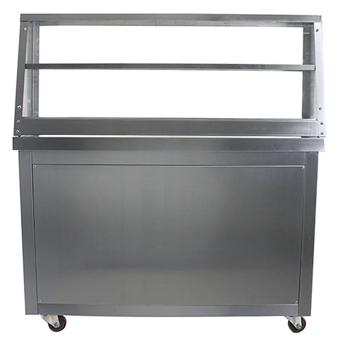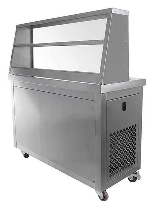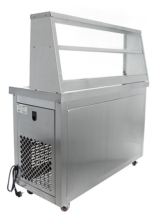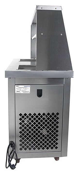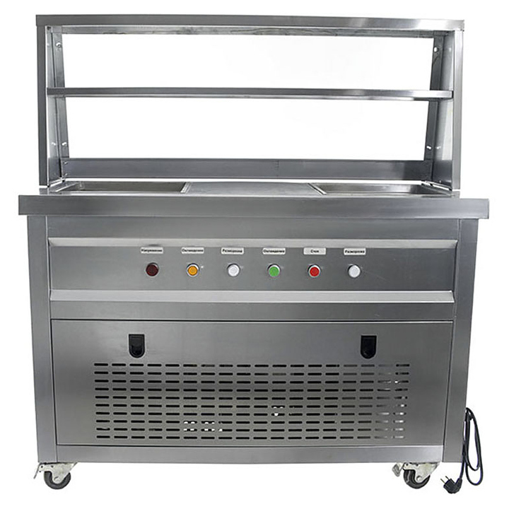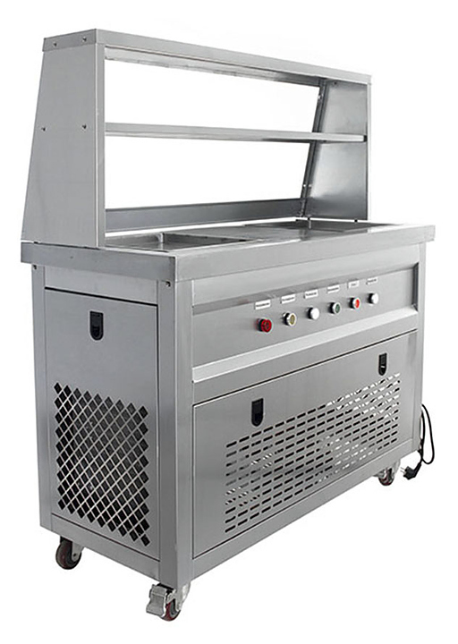 Фризер для мороженого Foodatlas KCB-2F используется на предприятиях общественного питания и торговли для приготовления жареного мороженого в роллах. Модель оснащена механическим управлением, столом для топпингов, 6 квадратными контейнерами, 2 квадратными охлаждаемыми поверхностями для "жарки" десерта при минусовой температуре и 4 колесами, 2 из которых снабжены тормозом. Корпус выполнен из нержавеющей стали 430, сковорода и контейнеры - из нержавеющей стали 304, радиатор - из алюминия, каркас светового короба - из оргстекла, полотно светового короба - из ПВХ.