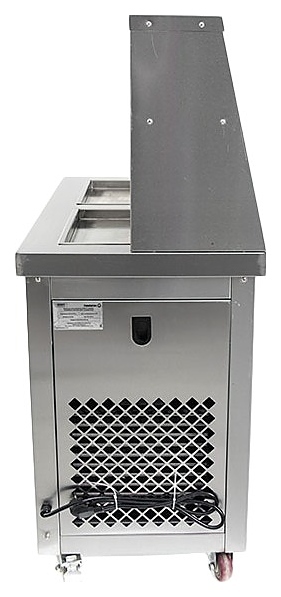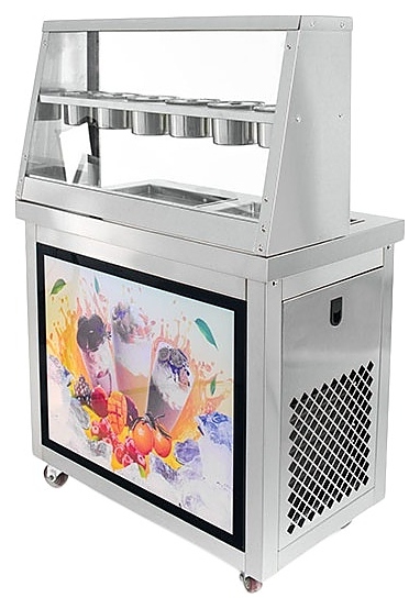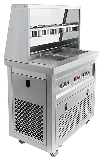 Напольный фризер для мороженого Foodatlas KCB-2F используется на предприятиях общественного питания и торговли для приготовления жареного мороженого в роллах. Модель оснащена компрессором, световым коробом, 2 квадратными сковородами для «жарки» десерта при минусовой температуре и последующего скручивания продукта в роллы, кнопочной панелью управления и кабелем питания с евровилкой. Корпус, сковороды и контейнеры выполнены из высококачественной нержавеющей стали, упаковка – фанерный ящик.