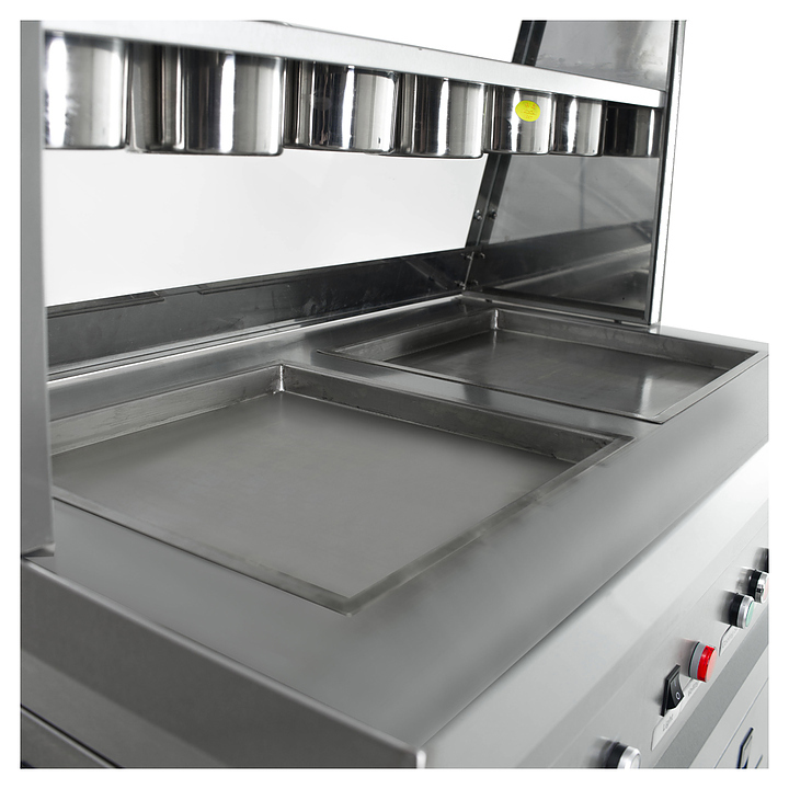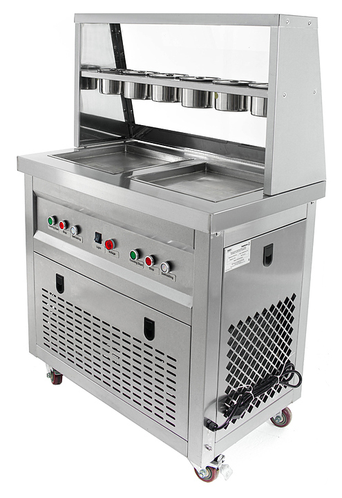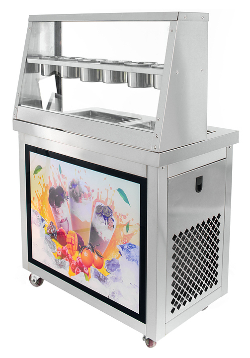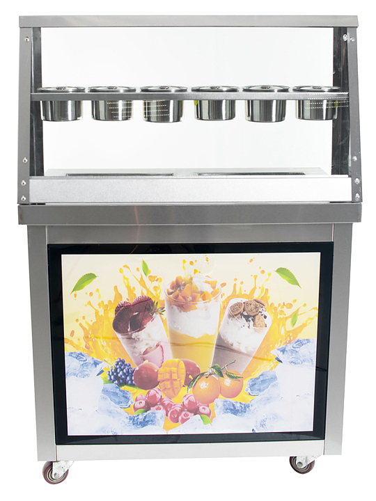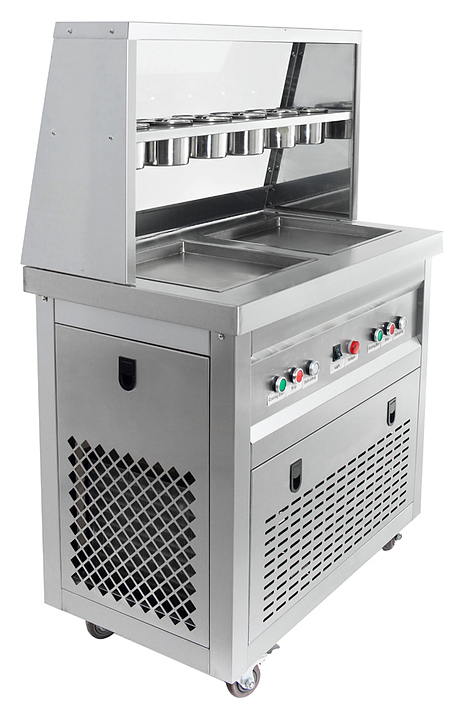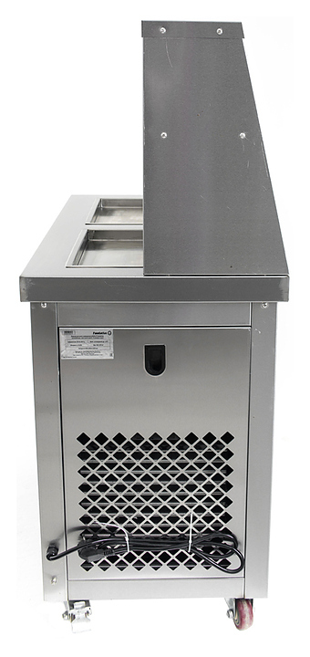 Фризер для мороженого Foodatlas KCB-2F используется на предприятиях общественного питания и торговли для приготовления жареного мороженого в роллах. Модель оснащена механическим управлением, 6 квадратными контейнерами, световым коробом, 2 квадратными охлаждаемыми поверхностями для "жарки" десерта при минусовой температуре и 4 колесами, 2 из которых снабжены тормозом. Корпус выполнен из нержавеющей стали 430, сковорода и контейнеры - из нержавеющей стали 304, радиатор - из алюминия, каркас светового короба - из оргстекла, полотно светового короба - из ПВХ.