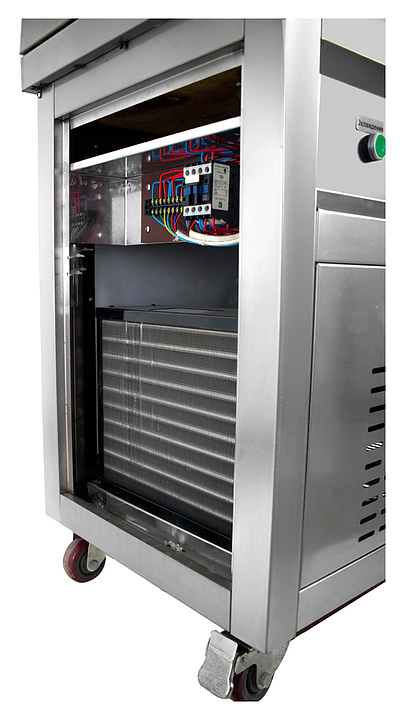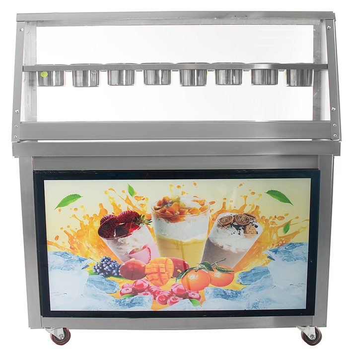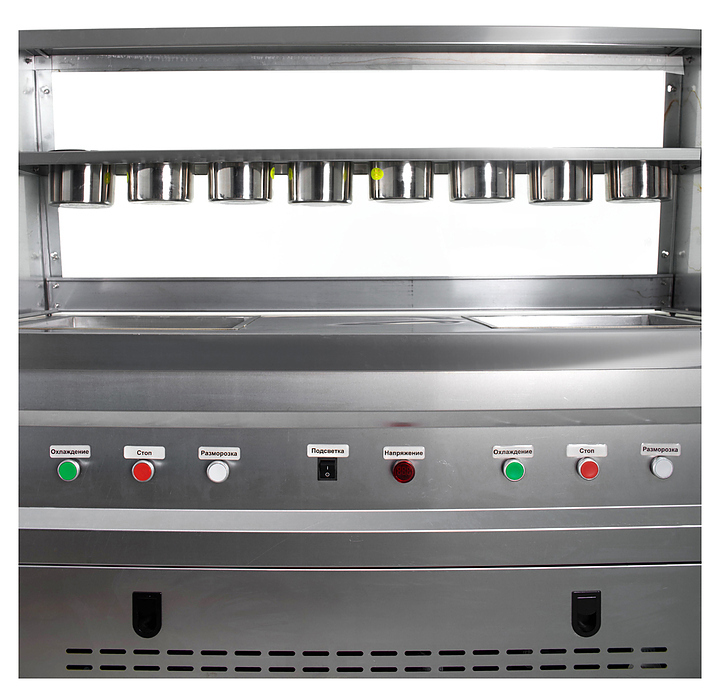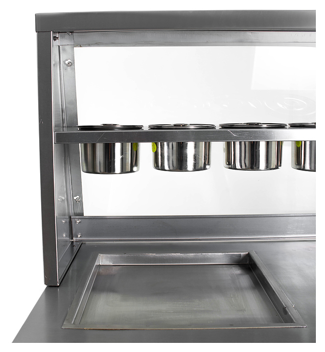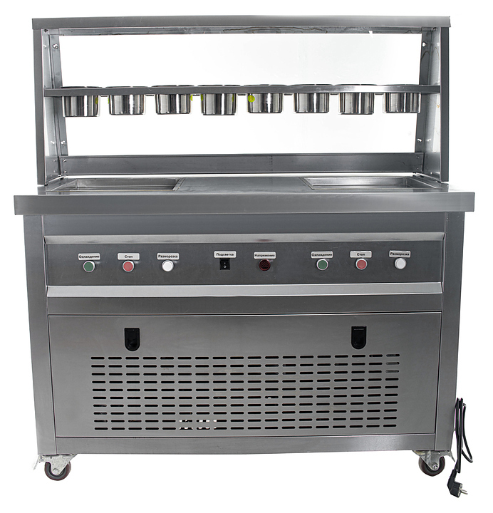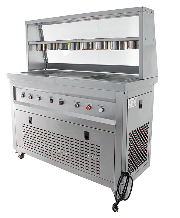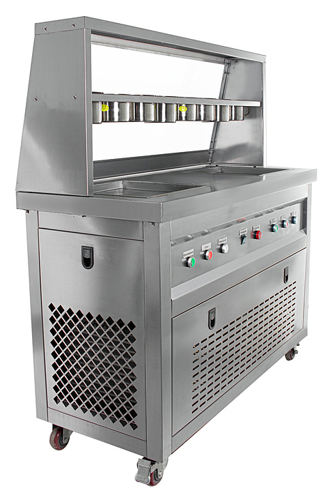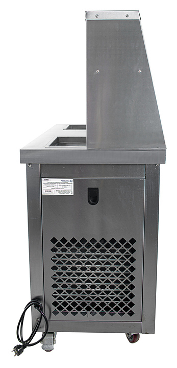 Фризер для мороженого Foodatlas KCB-2F используется на предприятиях общественного питания и торговли для приготовления жареного мороженого в роллах. Модель оснащена механическим управлением, столом для топпингов, 6 квадратными контейнерами, световым коробом, 2 квадратными охлаждаемыми поверхностями для "жарки" десерта при минусовой температуре и 4 колесами, 2 из которых снабжены тормозом. Корпус выполнен из нержавеющей стали 430, сковорода и контейнеры - из нержавеющей стали 304, радиатор - из алюминия, каркас светового короба - из оргстекла, полотно светового короба - из ПВХ.