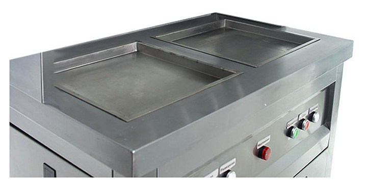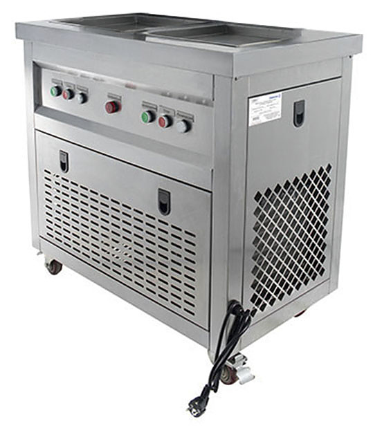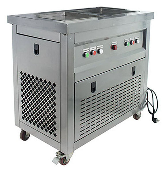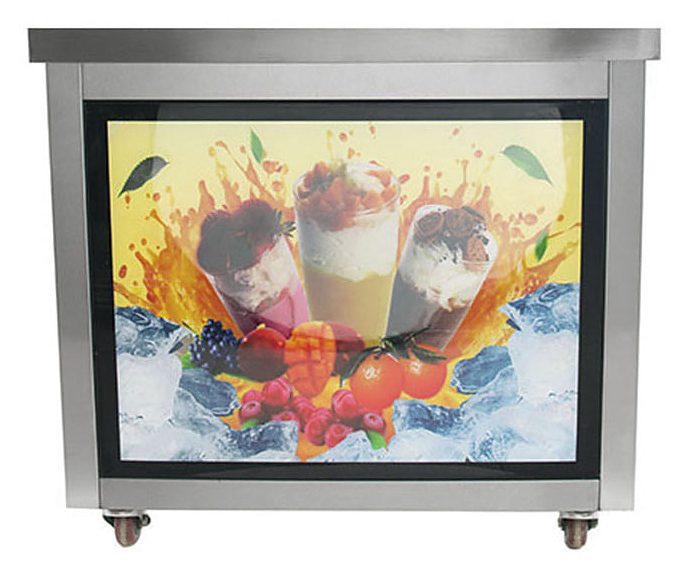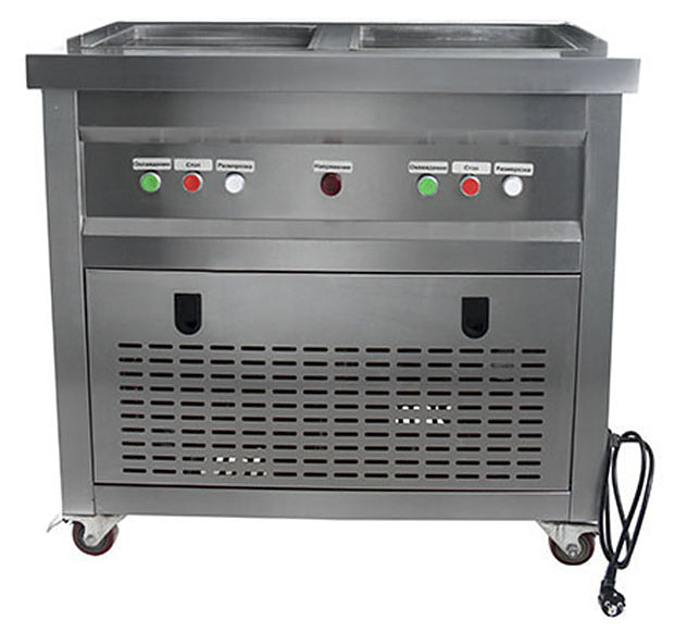 Фризер для мороженого Foodatlas KCB-2F используется на предприятиях общественного питания и торговли для приготовления жареного мороженого в роллах. Модель оснащена механическим управлением, световым коробом, 2 квадратными охлаждаемыми поверхностями для "жарки" десерта при минусовой температуре и 4 колесами, 2 из которых снабжены тормозом. Корпус выполнен из нержавеющей стали 430, сковорода и контейнеры - из нержавеющей стали 304, радиатор - из алюминия, каркас светового короба - из оргстекла, полотно светового короба - из ПВХ.