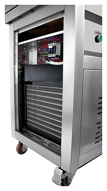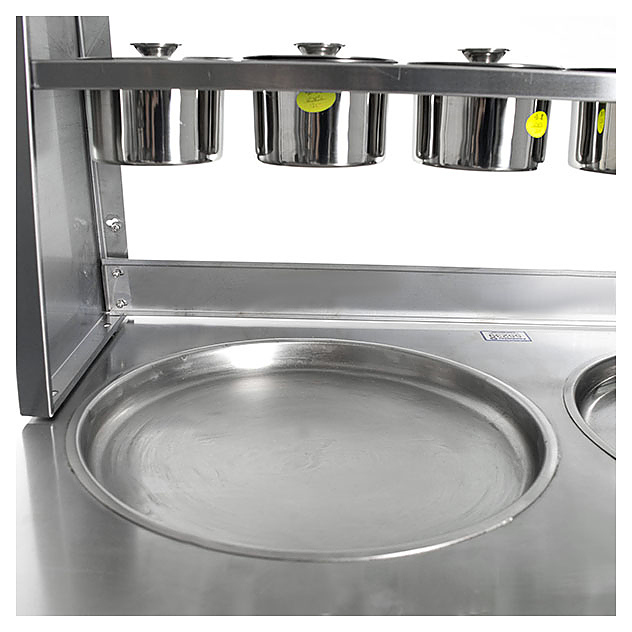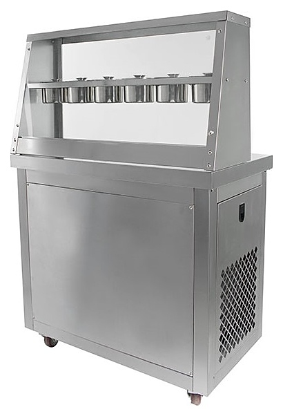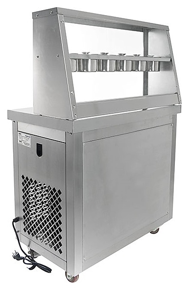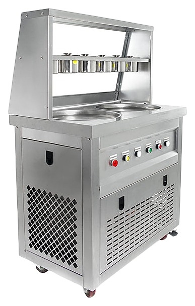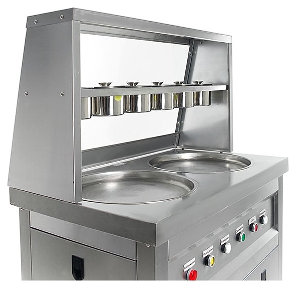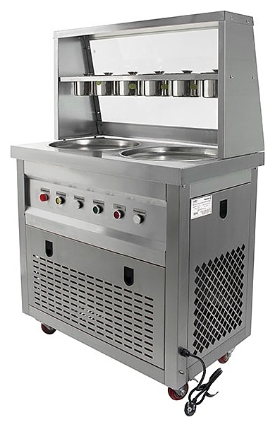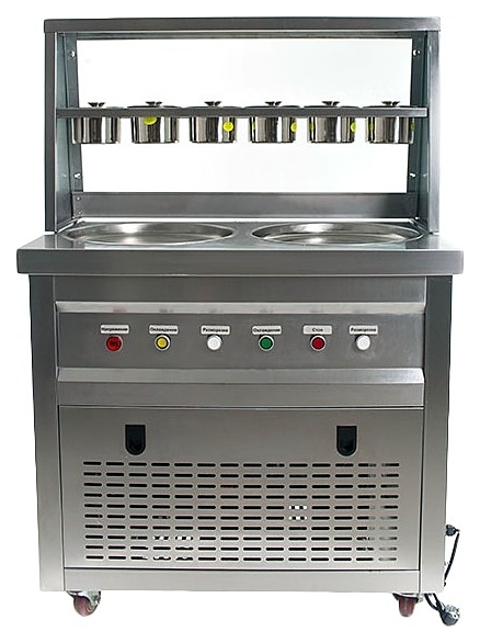 Напольный фризер для мороженого Foodatlas KCB-2Y используется на предприятиях общественного питания и торговли для приготовления жареного мороженого в роллах. Модель оснащена 2 компрессорами, 2 круглыми сковородами для «жарки» десерта при минусовой температуре и последующего скручивания продукта в роллы, кнопочной панелью управления и кабелем питания с евровилкой. Корпус, сковороды и контейнеры выполнены из высококачественной нержавеющей стали, упаковка – фанерный ящик.