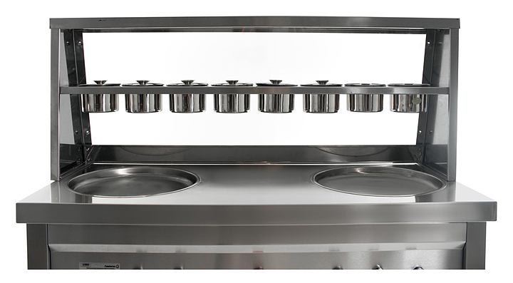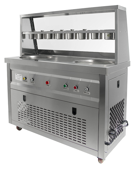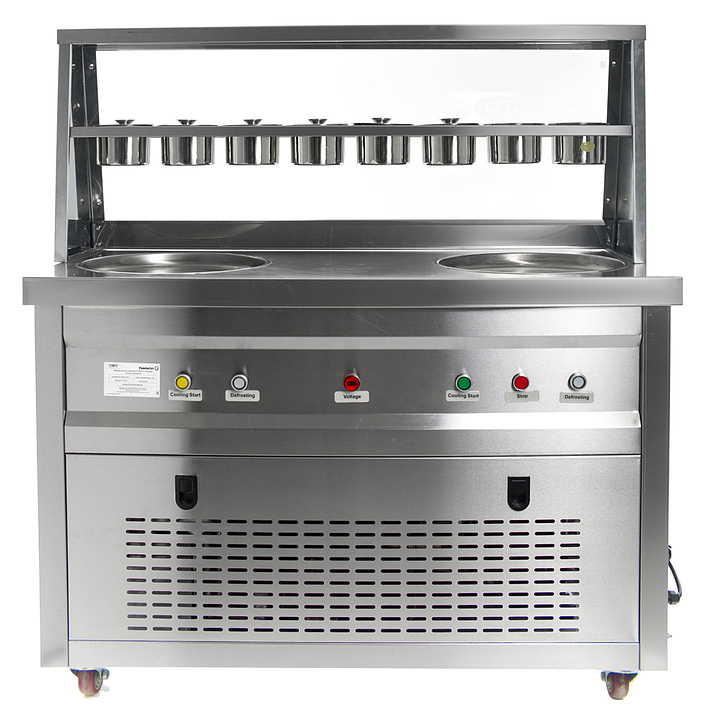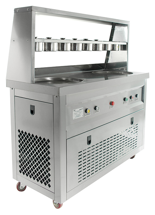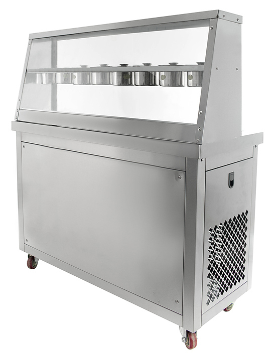 Фризер для мороженого Foodatlas KCB-2Y используется на предприятиях общественного питания и торговли для приготовления жареного мороженого в роллах. Модель оснащена механическим управлением, столом для топпингов, 6 квадратными контейнерами, 2 круглыми охлаждаемыми поверхностями для "жарки" десерта при минусовой температуре и 4 колесами, 2 из которых снабжены тормозом. Корпус выполнен из нержавеющей стали 430, сковорода и контейнеры - из нержавеющей стали 304, радиатор - из алюминия, каркас светового короба - из оргстекла, полотно светового короба - из ПВХ.