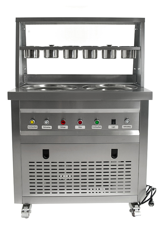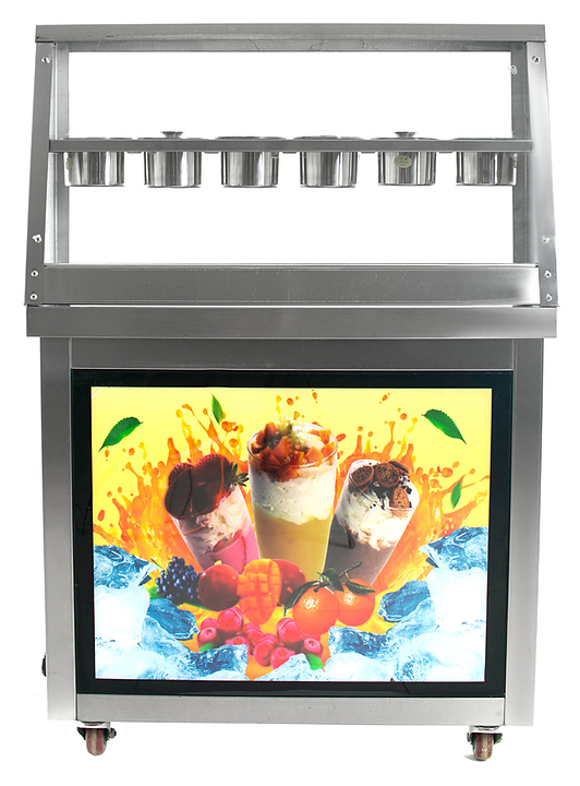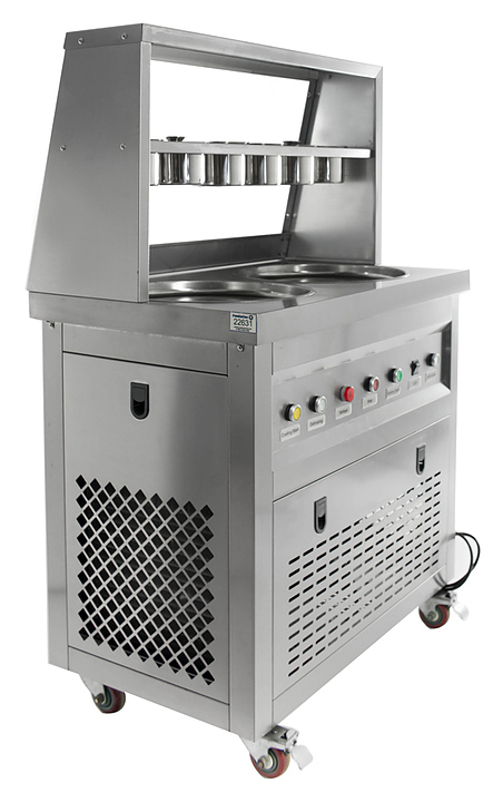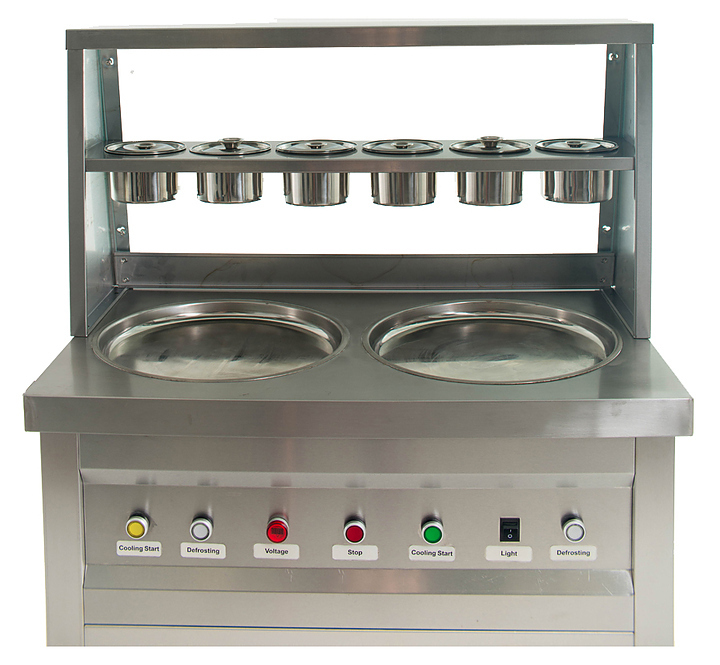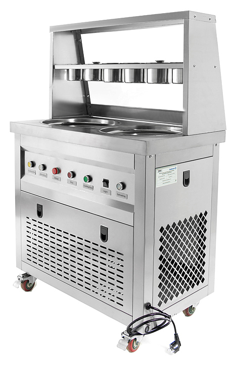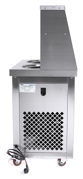 Фризер для мороженого Foodatlas KCB-2Y используется на предприятиях общественного питания и торговли для приготовления жареного мороженого в роллах. Модель оснащена механическим управлением, 6 квадратными контейнерами, световым коробом, 2 круглыми охлаждаемыми поверхностями для "жарки" десерта при минусовой температуре и 4 колесами, 2 из которых снабжены тормозом. Корпус выполнен из нержавеющей стали 430, сковорода и контейнеры - из нержавеющей стали 304, радиатор - из алюминия, каркас светового короба - из оргстекла, полотно светового короба - из ПВХ.