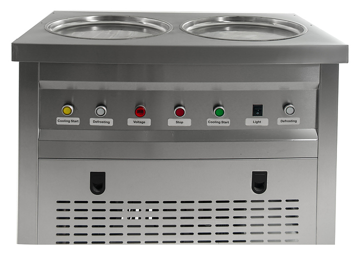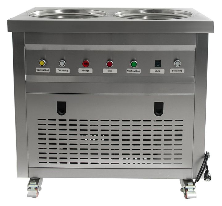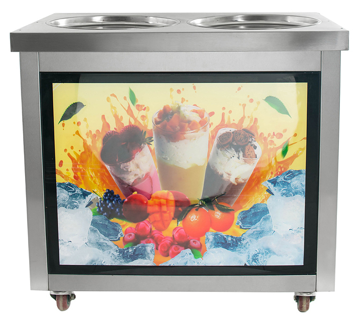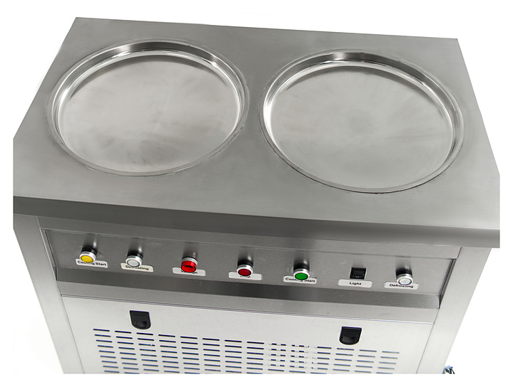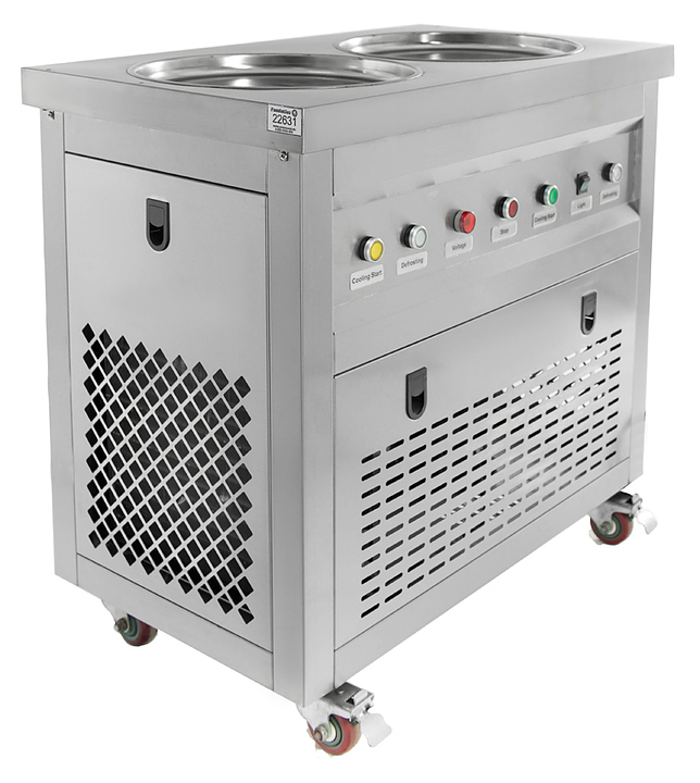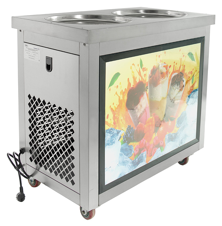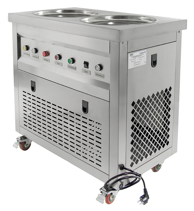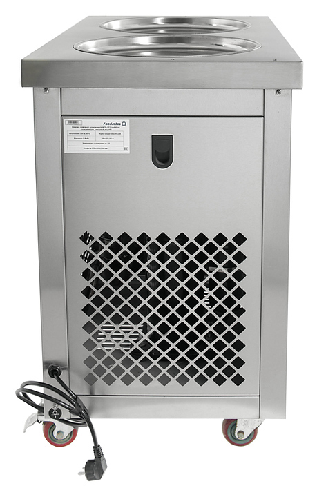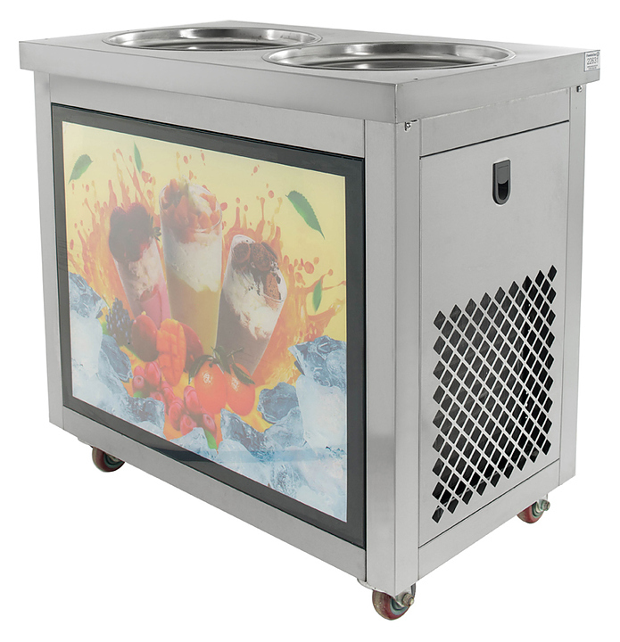 Фризер для мороженого Foodatlas KCB-2Y используется на предприятиях общественного питания и торговли для приготовления жареного мороженого в роллах. Модель оснащена механическим управлением, световым коробом, 2 круглыми охлаждаемыми поверхностями для "жарки" десерта при минусовой температуре и 4 колесами, 2 из которых снабжены тормозом. Корпус выполнен из нержавеющей стали 430, сковорода и контейнеры - из нержавеющей стали 304, радиатор - из алюминия, каркас светового короба - из оргстекла, полотно светового короба - из ПВХ.