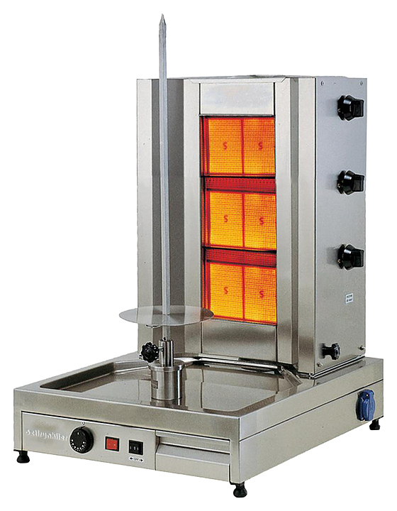 Газовый гриль для шаурмы OZTI 3GUD-W предназначен для обжарки большого количества различных видов мяса и птицы на предприятиях общественного питания, а также в производственных цехах, деятельность которых связана с выпуском гастрономических товаров. Корпус выполнен из нержавеющей стали.