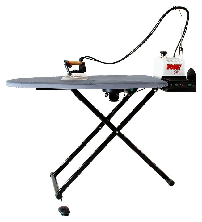 Гладильный стол PONY Omega Pro используется в домах, ателье, прачечных и химчистках с небольшой площадью помещения для глажки белья и одежды. Модель оснащена ножной педалью управления мощностью вентилятора, 12 позициями настройки высоты и штырем для механической блокировки.