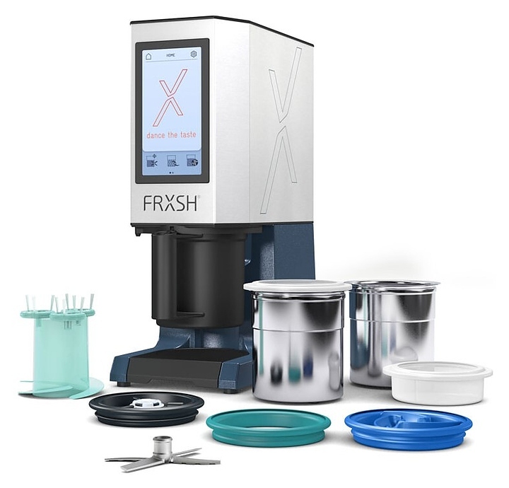 Гомогенизатор FRXSH Mousse Chef предназначен для измельчения продуктов питания, приготовления пюре, воздушных муссов, рыбных и мясных паштетов, концентратов овощей и специй, паст, кремообразных начинок, соусов, готового жидкого теста, мороженого и сорбетов, а также для смешивания ингредиентов на предприятиях общественного питания и торговли. Модель оснащена сенсорным цветным дисплеем. Корпус выполнен из нержавеющей стали и алюминия.