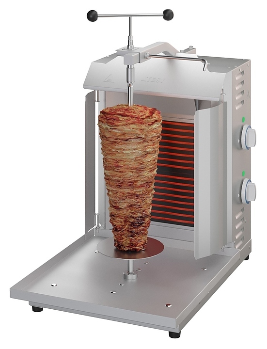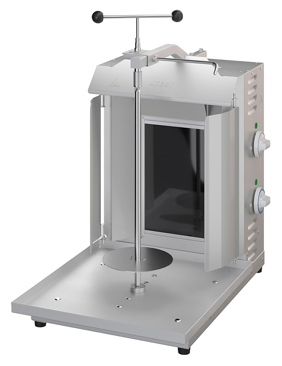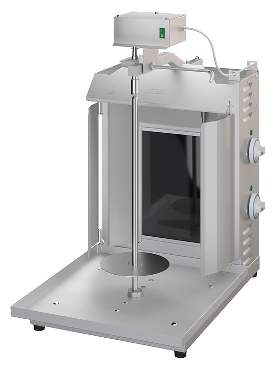 Электрический гриль ATESY Шаурма-2-ИК-06-Н используется на предприятиях общественного питания и торговли для приготовления мясной начинки популярного блюда шаурма (шаверма). Модель оснащена отражателями тепла и защитным козырьком. Корпус выполнен из нержавеющей стали AISI 430, нагревательный элемент - из стеклокерамики.