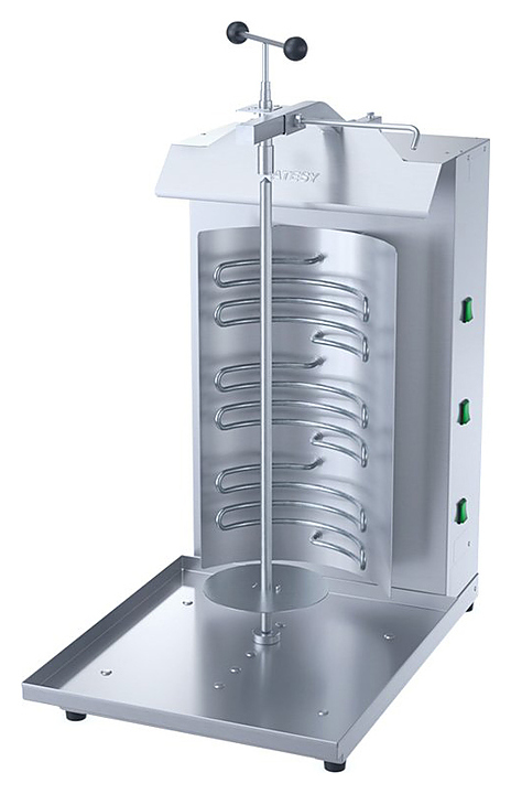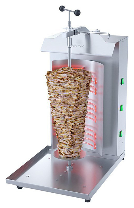 Электрический гриль ATESY Шаурма 3-Эл-05-Н используется на предприятиях общественного питания и торговли для приготовления мясной начинки популярного блюда шаурма (шаверма). Модель оснащена 3 трубчатыми электронагревателями (ТЭНами). Корпус выполнен из нержавеющей стали, все элементы, контактирующие с пищей - из материалов, разрешенных для контакта с пищевыми продуктами.