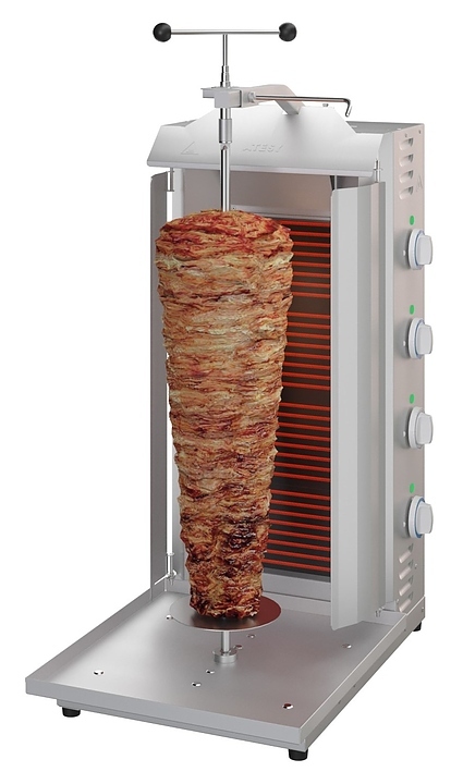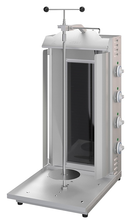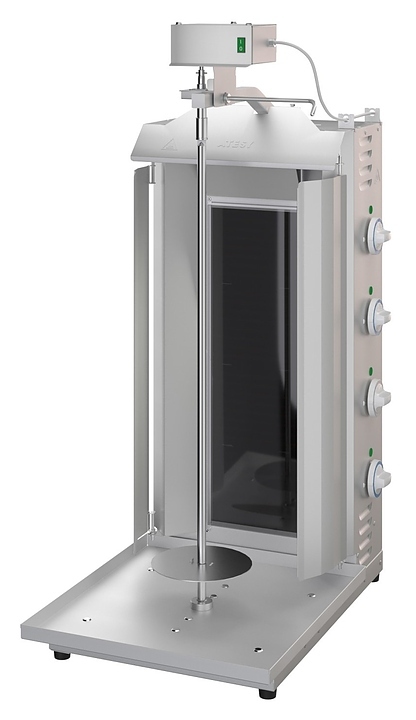 Электрический гриль ATESY Шаурма-4-ИК-06-Н используется на предприятиях общественного питания и торговли для приготовления мясной начинки популярного блюда шаурма (шаверма). Модель оснащена отражателями тепла и защитным козырьком. Корпус выполнен из нержавеющей стали AISI 430, нагревательный элемент - из стеклокерамики.