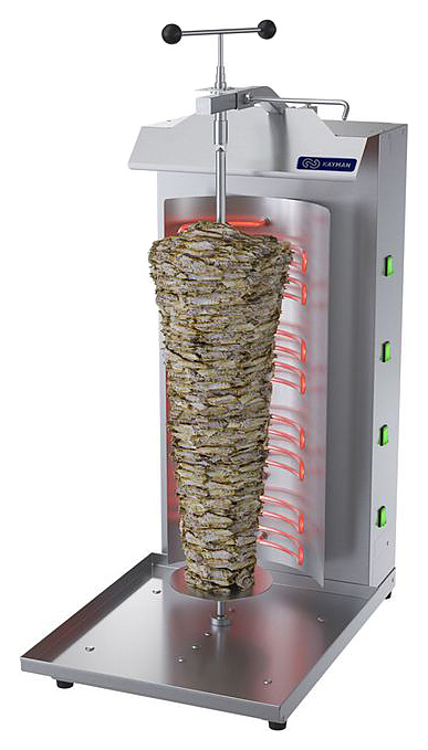 Электрический гриль KAYMAN ШЭ-ОЦ-4-РП А используется на предприятиях общественного питания и торговли для приготовления мясной начинки популярного блюда шаурма (шаверма). Модель оснащена 4 изогнутыми ТЭНами, отражателями тепла и защитным козырьком, препятствующим обжиганию рук и перегреву электропривода. Корпус выполнен из нержавеющей стали, все элементы, контактирующие с пищей - из материалов, разрешенных для контакта из оцинкованной стали.