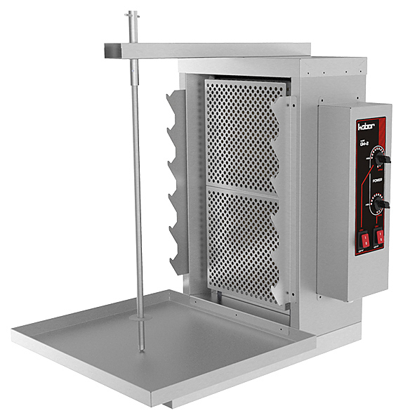 Гриль для шаурмы Кобор GM-2 используется на предприятиях общественного питания и торговли для обжарки большого количества различных видов мяса и птицы для приготовления начинки из рубленного мяса для шаурмы и других блюд. Боковые держатели позволяют использовать шампура для приготовления шашлыка и кебабов. Модель оснащена 2 ТЭНами. Корпус выполнен из пищевой нержавеющей стали.
