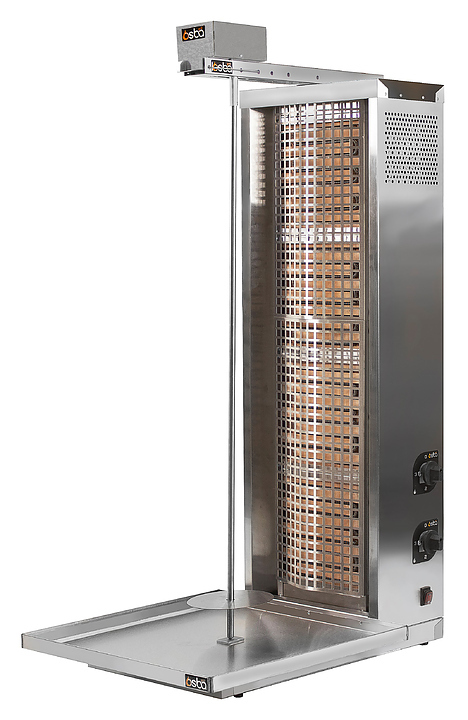 Гриль для шаурмы Osba 3.4K+ предназначен для обжарки большого количества различных видов мяса и птицы для приготовления начинки для шаурмы, донера и других блюд на предприятиях общественного питания и торговли. Модель оснащена 4 нагревательными элементами и защитной сеткой. Корпус выполнен из нержавеющей стали AISI 304.