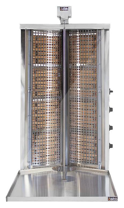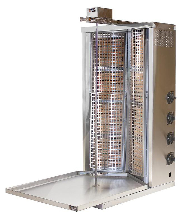 Гриль Osba 3.8K+ предназначен для обжарки большого количества различных видов мяса и птицы при приготовлении начинки для шаурмы, донера и других блюд на предприятиях общественного питания и торговли. Размещение на вертикальном вертеле и электрическое управление вращением обеспечивают равномерное приготовление. Модель оснащена 8 зонами нагрева с 2 уровнями мощности. Решетка на нагревательных элементах гарантирует безопасность и чистоту во время приготовления. Перемещение вертела вперед и назад позволяет регулировать расстояние между мясом и нагревом при разном количестве заготовки. Корпус и решетка выполнены из нержавеющей стали, которая отличается прочностью и долговечностью.