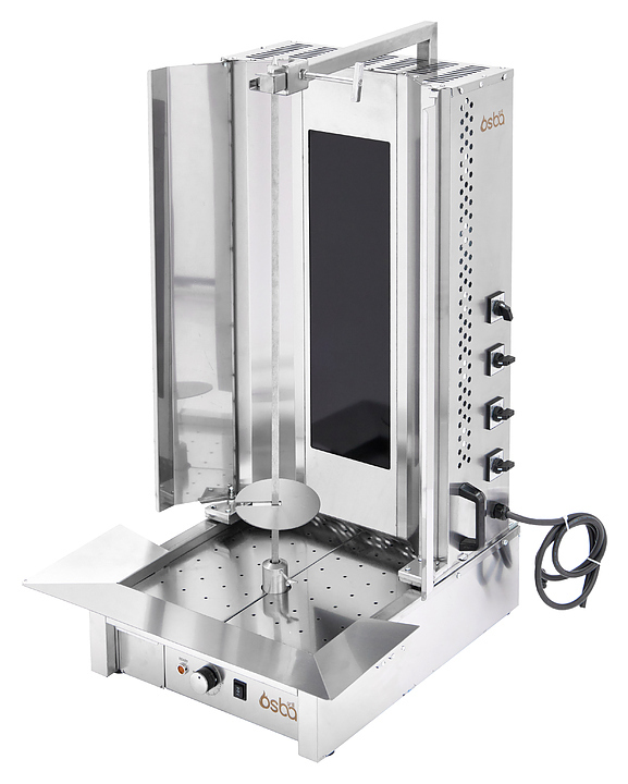 Гриль для шаурмы Osba ALT-04E предназначен для обжарки большого количества различных видов мяса и птицы для приготовления начинки для шаурмы, донера и других блюд на предприятиях общественного питания и торговли. Модель оснащена 4 ТЭНами, нижним мотором и керамическим стеклом для защиты нагревательных элементов от попадания масла. Корпус выполнен из нержавеющей стали AISI 304.