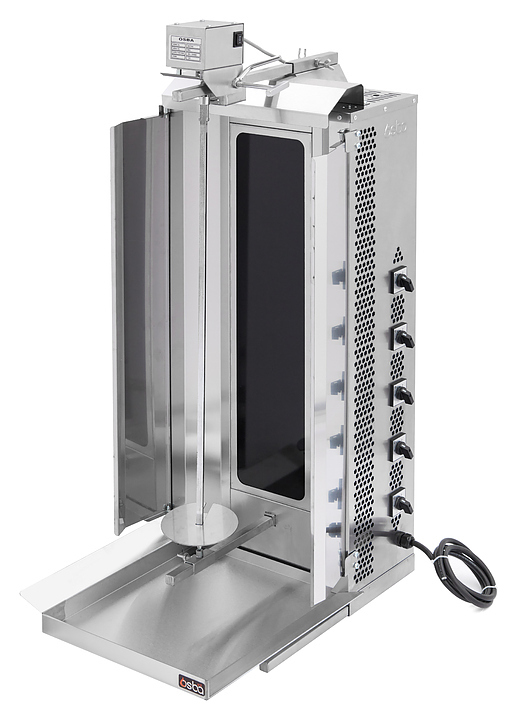 Гриль для шаурмы Osba MED-05E предназначен для обжарки большого количества различных видов мяса и птицы для приготовления начинки для шаурмы, донера и других блюд на предприятиях общественного питания и торговли. Модель оснащена 5 ТЭНами, верхним мотором и керамическим стеклом для защиты нагревательных элементов от попадания масла. Корпус выполнен из нержавеющей стали AISI 304.