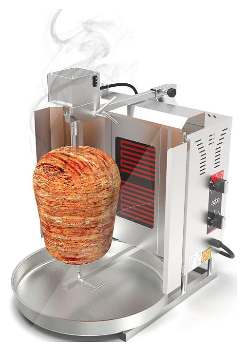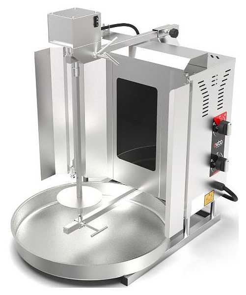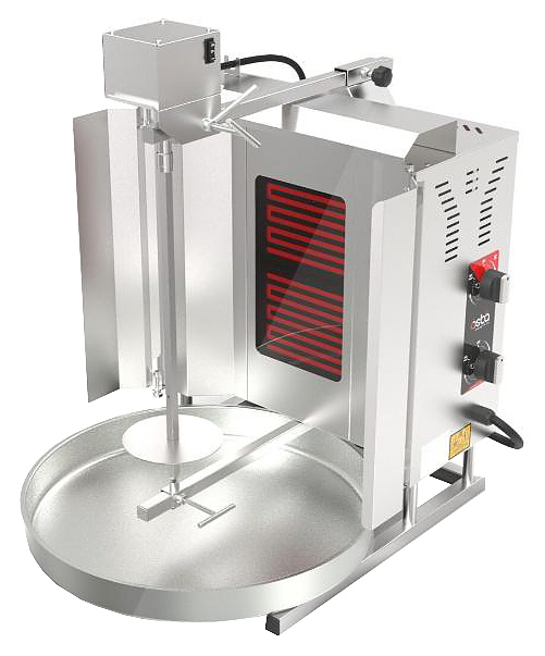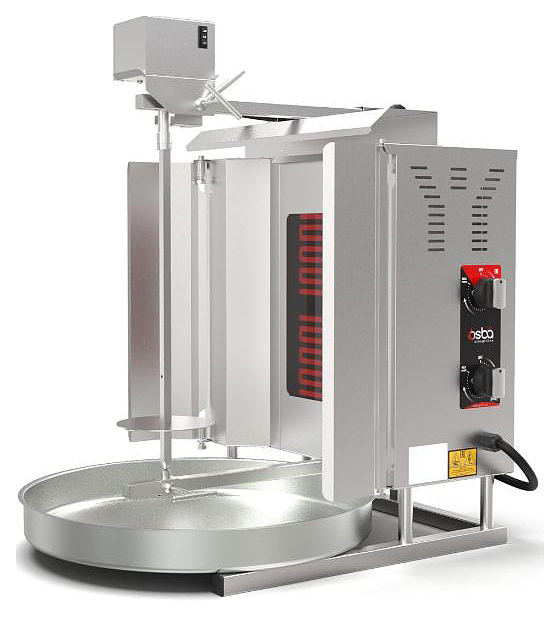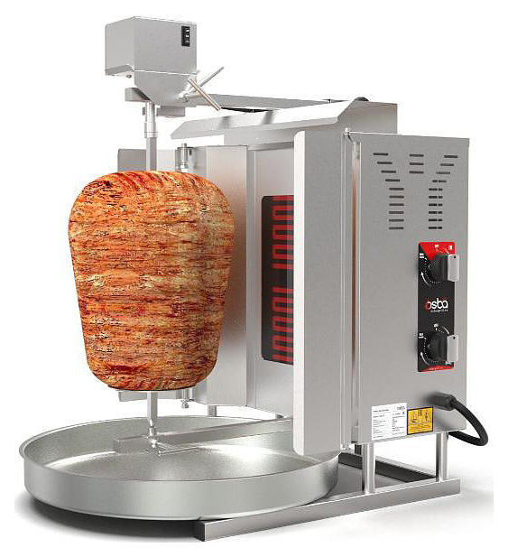 Гриль для шаурмы Osba SD10 предназначен для обжарки большого количества различных видов мяса и птицы при приготовлении начинки для шаурмы, донера и других блюд на предприятиях общественного питания и торговли. Размещение на вертикальном вертеле и электрическое управление вращением обеспечивают равномерное приготовление. Модель оснащена защитным козырьком, 2 зонами нагрева, каждая из которых имеет индивидуальное управление с плавной регулировкой мощности. Покрытие на нагревательных элементах гарантирует легкую очистку. Перемещение вертела вперед и назад позволяет регулировать расстояние между мясом и нагревом при разном количестве заготовки. Корпус выполнен из нержавеющей стали, которая отличается прочностью и долговечностью, защита нагревателей - из жаростойкой стеклокерамики.
