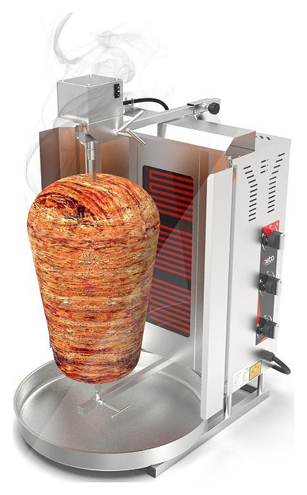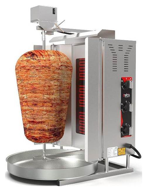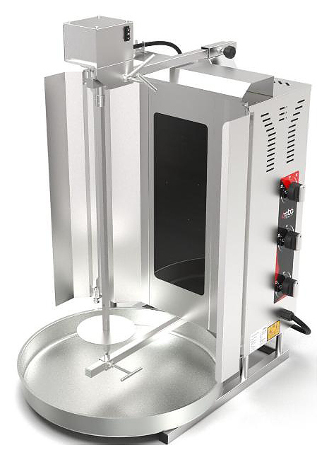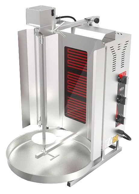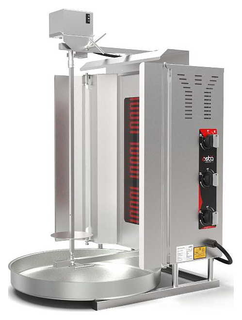 Электрический гриль Osba SD14 предназначен для обжарки большого количества различных видов мяса и птицы при приготовлении начинки для шаурмы, донера и других блюд на предприятиях общественного питания и торговли. Размещение на вертикальном вертеле и электрическое управление вращением обеспечивают равномерное приготовление. Модель оснащена защитным козырьком, 3 зонами нагрева, каждая из которых имеет индивидуальное управление с плавной регулировкой мощности. Покрытие на нагревательных элементах гарантирует легкую очистку. Перемещение вертела вперед и назад позволяет регулировать расстояние между мясом и нагревом при разном количестве заготовки. Корпус выполнен из нержавеющей стали, которая отличается прочностью и долговечностью, защита нагревателей - из жаростойкой стеклокерамики.