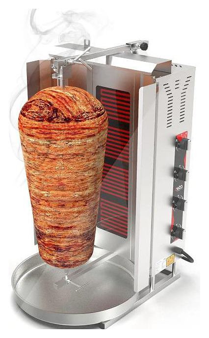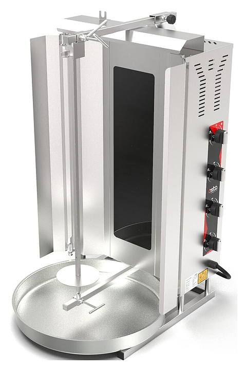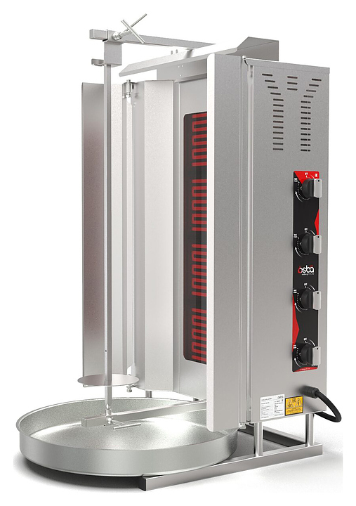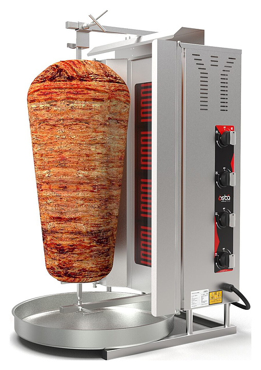 Электрический гриль Osba SD16 предназначен для обжарки большого количества различных видов мяса и птицы при приготовлении начинки для шаурмы, донера и других блюд на предприятиях общественного питания и торговли. Размещение на вертикальном вертеле и ручное управление вращением обеспечивают равномерное приготовление. Модель оснащена защитным козырьком, 4 зонами нагрева, каждая из которых имеет индивидуальное управление с плавной регулировкой мощности. Покрытие на нагревательных элементах гарантирует легкую очистку. Перемещение вертела вперед и назад позволяет регулировать расстояние между мясом и нагревом при разном количестве заготовки. Корпус выполнен из нержавеющей стали, которая отличается прочностью и долговечностью, защита нагревателей - из жаростойкой стеклокерамики.