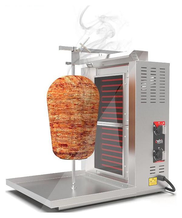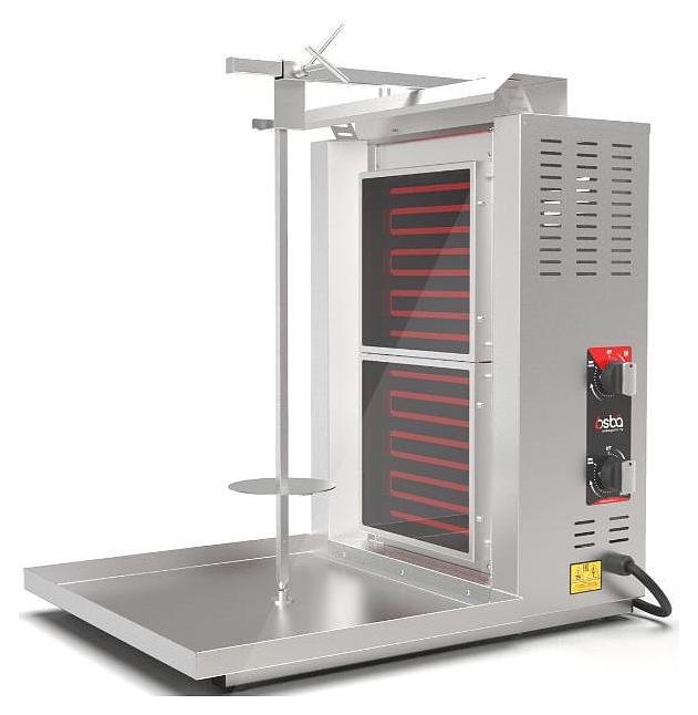 Электрический гриль Osba SH2-C предназначен для обжарки большого количества различных видов мяса и птицы при приготовлении начинки для шаурмы, донера и других блюд на предприятиях общественного питания и торговли. Размещение на вертикальном вертеле и ручное управление вращением обеспечивают равномерное приготовление. Модель оснащена защитным козырьком и 2 зонами нагрева, каждая из которых имеет индивидуальное управление с плавной регулировкой мощности. Покрытие на нагревательных элементах гарантирует легкую очистку. Перемещение вертела вперед и назад позволяет регулировать расстояние между мясом и нагревом при разном количестве заготовки. Корпус выполнен из пищевой нержавеющей стали, которая отличается прочностью и долговечностью, защита нагревателей - из жаростойкой стеклокерамики.