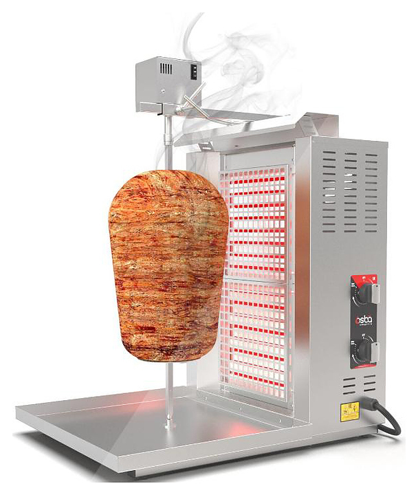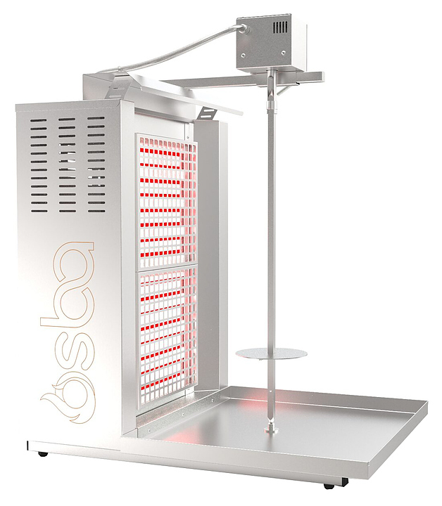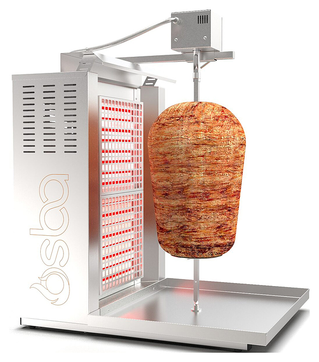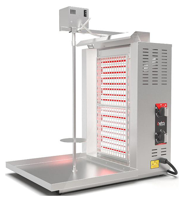 Электрический гриль Osba SH2-LE предназначен для обжарки большого количества различных видов мяса и птицы при приготовлении начинки для шаурмы, донера и других блюд на предприятиях общественного питания и торговли. Размещение на вертикальном вертеле и электрическое управление вращением обеспечивают равномерное приготовление. Модель оснащена защитным козырьком и 2 зонами нагрева, каждая из которых имеет индивидуальное управление с плавной регулировкой мощности. Перемещение вертела вперед и назад позволяет регулировать расстояние между мясом и нагревом при разном количестве заготовки. Корпус и решетка нагревателей выполнены из нержавеющей стали, которая отличается прочностью и долговечностью.