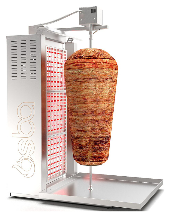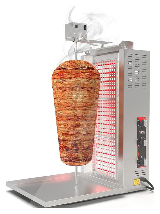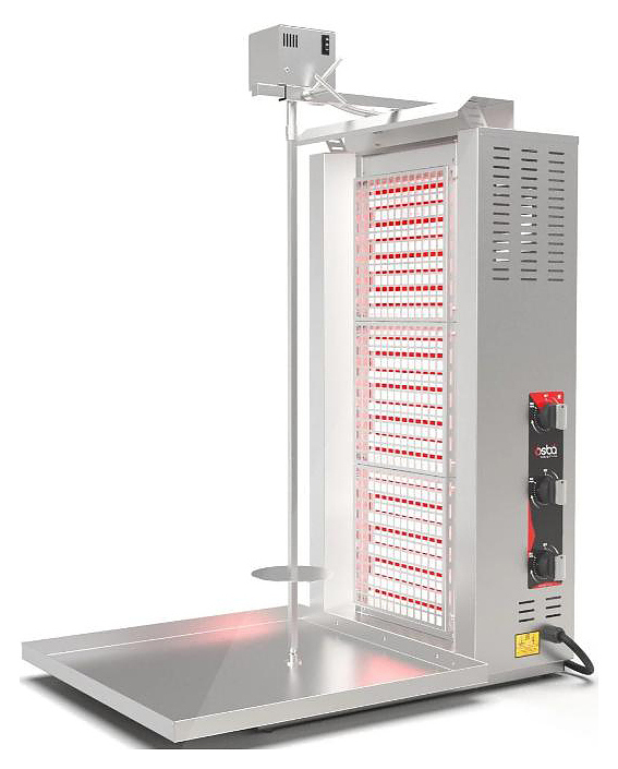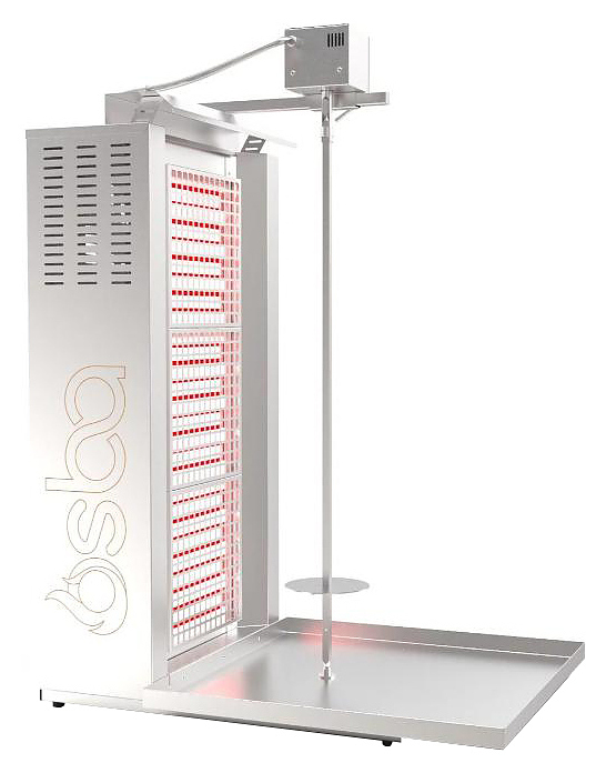 Электрический гриль Osba SH3-LE предназначен для обжарки большого количества различных видов мяса и птицы при приготовлении начинки для шаурмы, донера и других блюд на предприятиях общественного питания и торговли. Размещение на вертикальном вертеле и электрическое управление вращением обеспечивают равномерное приготовление. Модель оснащена защитным козырьком и 3 зонами нагрева, каждая из которых имеет индивидуальное управление с плавной регулировкой мощности. Перемещение вертела вперед и назад позволяет регулировать расстояние между мясом и нагревом при разном количестве заготовки. Корпус и решетка нагревателей выполнены из пищевой нержавеющей стали, которая отличается прочностью и долговечностью.