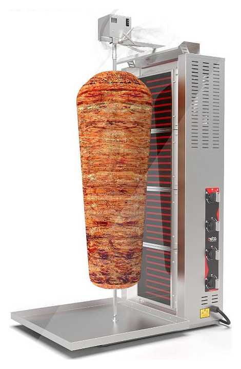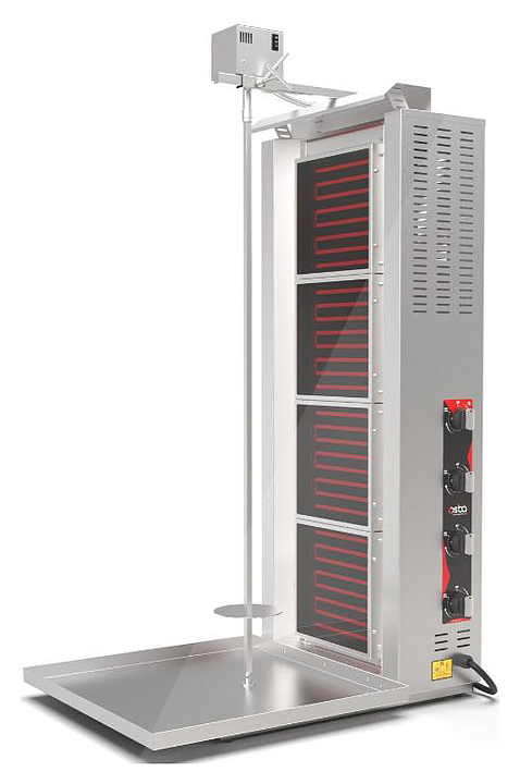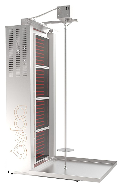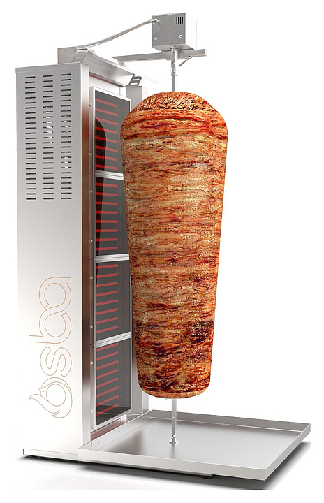 Электрический гриль Osba SH4-CE предназначен для обжарки большого количества различных видов мяса и птицы при приготовлении начинки для шаурмы, донера и других блюд на предприятиях общественного питания и торговли. Размещение на вертикальном вертеле и электрическое управление вращением обеспечивают равномерное приготовление. Модель оснащена защитным козырьком и 4 зонами нагрева, каждая из которых имеет индивидуальное управление с плавной регулировкой мощности. Покрытие на нагревательных элементах гарантирует легкую очистку. Перемещение вертела вперед и назад позволяет регулировать расстояние между мясом и нагревом при разном количестве заготовки. Корпус выполнен из пищевой нержавеющей стали, которая отличается прочностью и долговечностью, защита нагревателей - из жаростойкой стеклокерамики.