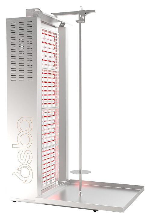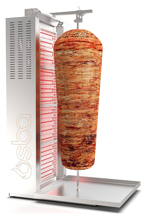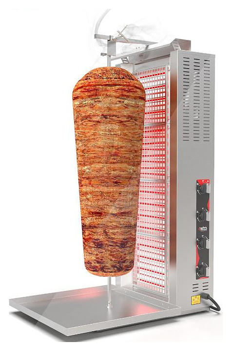 Электрический гриль Osba SH4-L предназначен для обжарки большого количества различных видов мяса и птицы при приготовлении начинки для шаурмы, донера и других блюд на предприятиях общественного питания и торговли. Размещение на вертикальном вертеле и ручное управление вращением обеспечивают равномерное приготовление. Модель оснащена защитным козырьком и 4 зонами нагрева, каждая из которых имеет индивидуальное управление с плавной регулировкой мощности. Перемещение вертела вперед и назад позволяет регулировать расстояние между мясом и нагревом при разном количестве заготовки. Корпус и решетка нагревателей выполнены из пищевой нержавеющей стали, которая отличается прочностью и долговечностьюи.