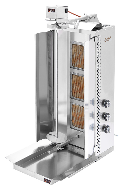 Гриль для шаурмы Osba UST-03G предназначен для обжарки большого количества различных видов мяса и птицы для приготовления начинки для шаурмы, донера и других блюд на предприятиях общественного питания и торговли. Модель оснащена 3 инфракрасными горелками с независимым управлением и верхним мотором. Корпус выполнен из нержавеющей стали AISI 304.
