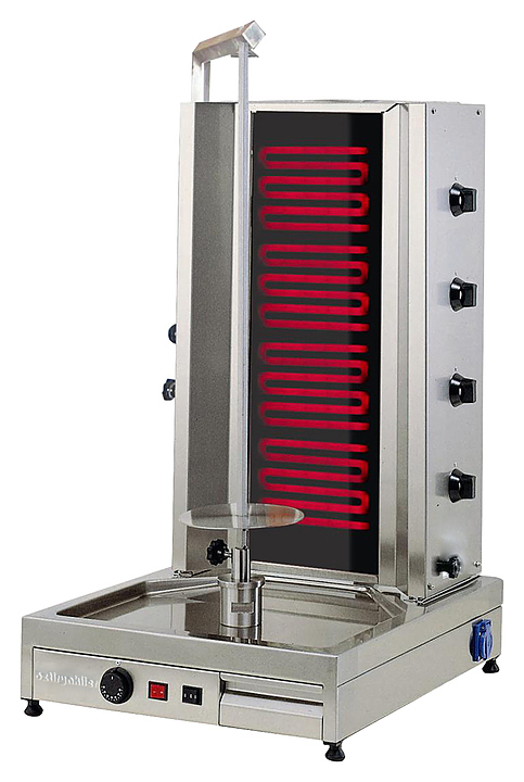 Гриль для шаурмы OZTI 4EU-W предназначен для обжарки большого количества различных видов мяса и птицы на предприятиях общественного питания, а также в производственных цехах, деятельность которых связана с выпуском гастрономических товаров. Корпус выполнен из нержавеющей стали, панель перед нагревательными элементами - из керамического стекла.