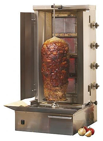 Гриль для шаурмы Roller Grill GR 80 E используется на предприятиях общественного питания и торговли для приготовления мясной начинки для шаурмы. Конструкция на шарикоподшипниках способна выдерживать большой вес мяса без перекрашивания. Корпус выполнен из нержавеющей стали.
