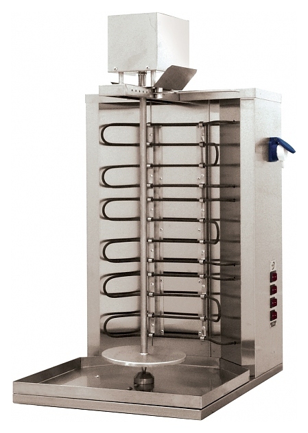 Гриль для шаурмы Sikom МК-2.2ЭП предназначен для обжарки различных типов и видов мяса в больших количествах на предприятиях общественного питания: в барах, кафе, закусочных и бистро. Модель оснащена поддоном для сбора жира, вилкой для фиксации вертела и тарелкой для удерживания мяса. Все элементы прибора выполнены из высококачественной пищевой нержавеющей стали.