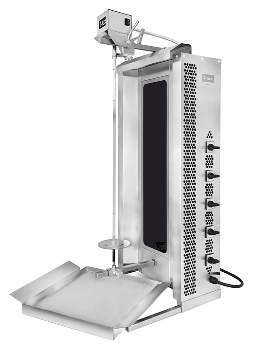 Гриль для шаурмы T-LUX SMU-5 используется на предприятиях общественного питания и торговли для обжарки большого количества различных видов мяса и птицы для приготовления начинки из рубленного мяса для шаурмы и других блюд. Модель оснащена ТЭНами с керамическим термостойким защитным стеклом Robax, предотвращающим попадание масла на них. Корпус выполнен из нержавеющей стали AISI 304.